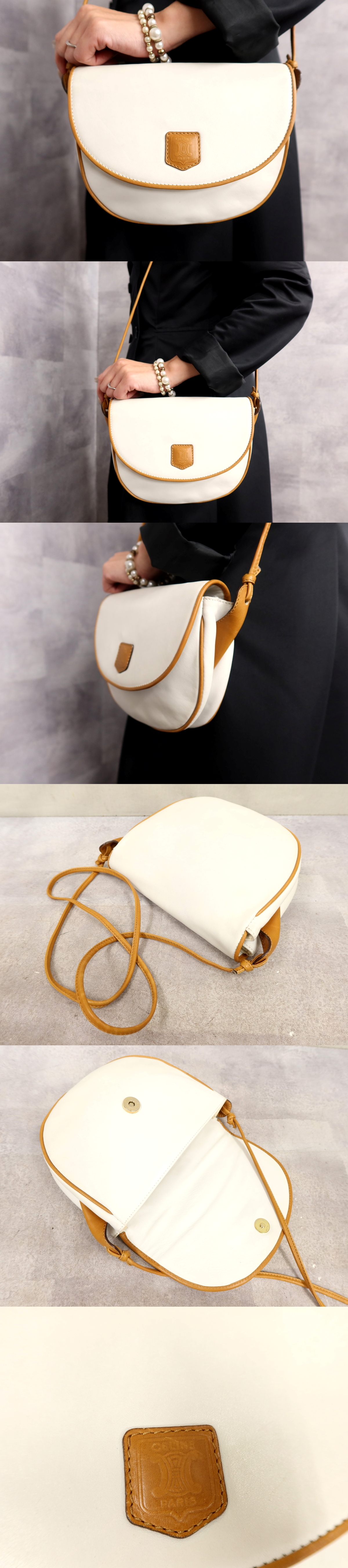 ●超美品●CELINE セリーヌ●ロゴ型押し●バイカラー●カーフ レザー 本革●ショルダー バッグ●白 キャメル●ゴールド金具●Js63436 收藏