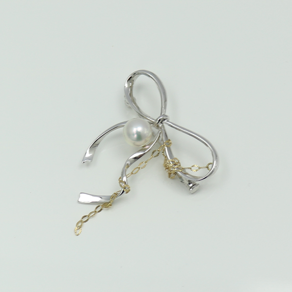 | 真珠 パー ルブローチ アコヤ真珠 8mm-8.5mm ホワイトカラー K10 ブローチ リボンチェーン6月誕生石 |