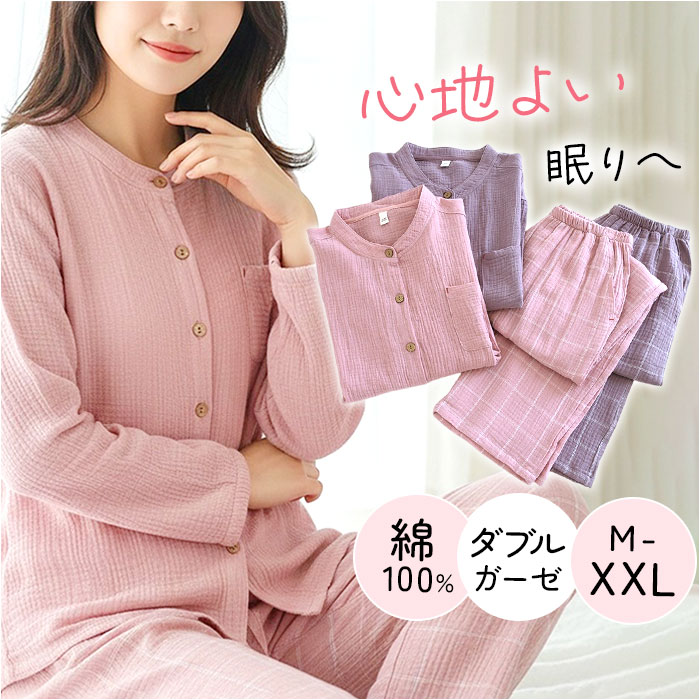 ☆ ピンク ☆ XLサイズ ☆ ダブルガーゼ パジャマ レディース 綿100% パジャマ レディース 綿100% 上下 セット 長袖パジャマ 收藏
