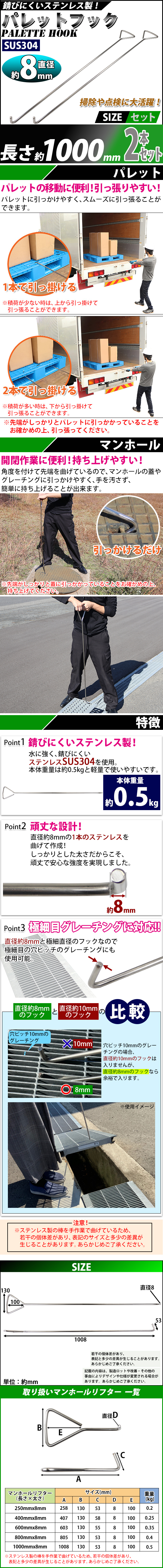 送料無料 パレットフック マンホールリフター 2本セット ステンレス製 ハイグレードモデル SUS304 直径約8mm 長さ約1000mm マンホール 收藏