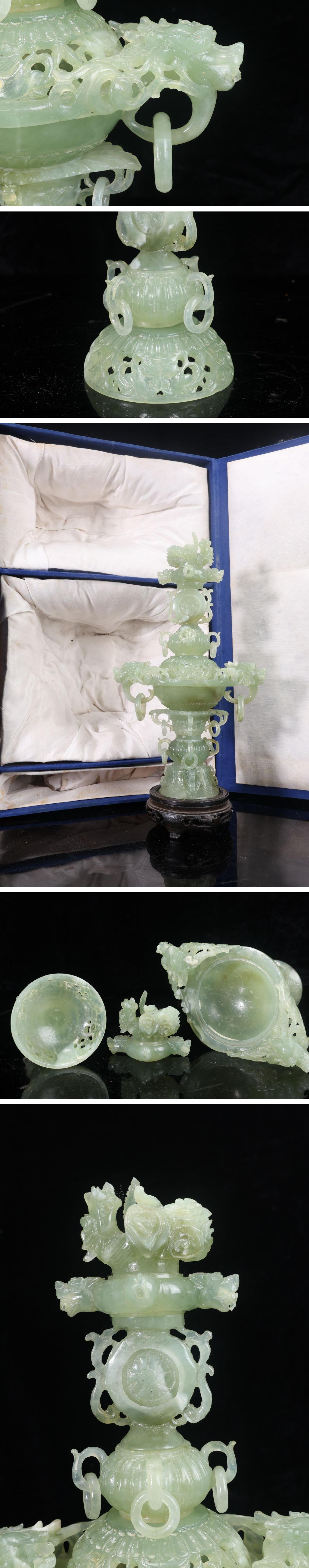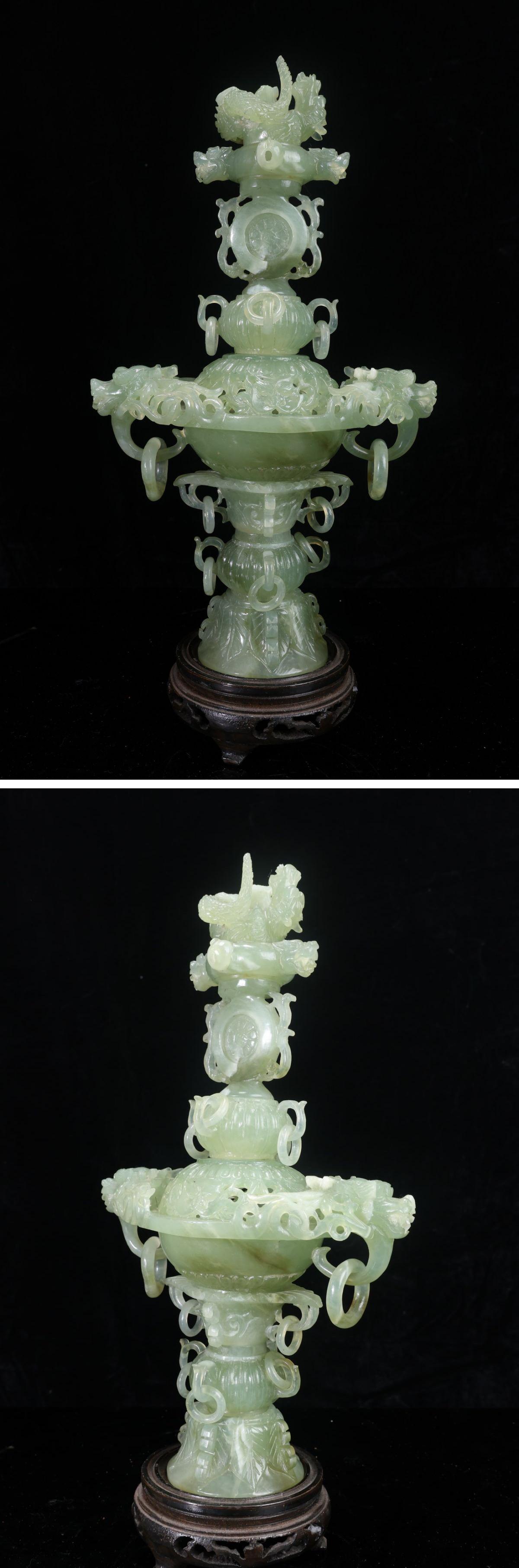 【珍品堂】1円から V25- 香炉 岫玉 天然石 透かし彫 手彫り 龍雙耳 遊環 高27.5㎝ 台付 箱付 置物 縁起物 希少 骨董品 古美術 時代物 收藏