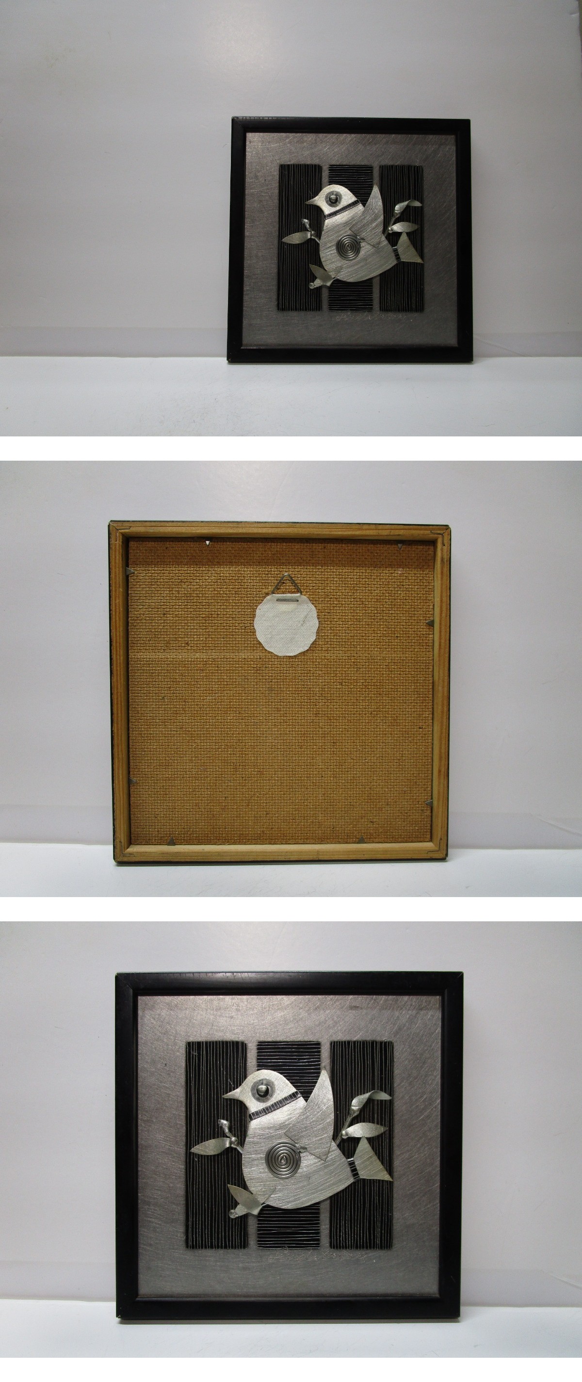 コルク板に貼り合わせたアルミ板に細かく刻んだ鋤き模様、その上に貼り合わせた細かなアルミパーツで表現されたかなりデフォルメをくわえられた鳥がミッドセンチュリー期の北欧デザインらしいモダンな中に親しみやすい表情をのぞかせています。重層的な構成なので、作品に奥行きが感じられます。同時期に活躍した同じ北欧スウェーデンのS.リンドベリやリサラーソンの陶板作品に通じるほどよいコミカライズをくわえられた造形がユニークな1品です。