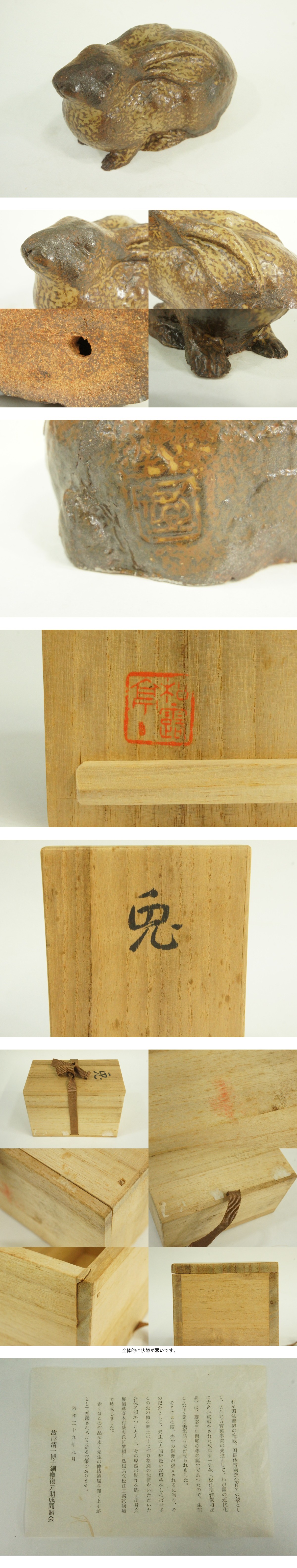 ●九谷焼 兎 昭和39年制作 岸清一銅像復元記念品 木村威夫(原型制作) 陶器 置物 状態良好 共箱