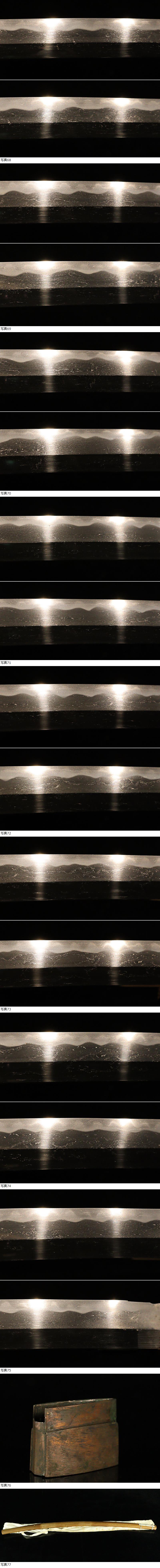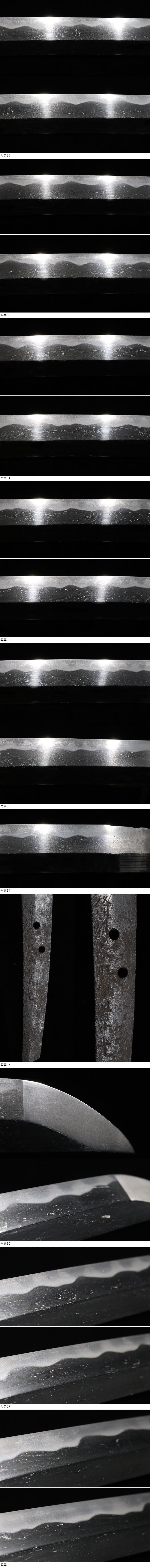| ■刀剣のサイズ表示について 元幅・・・焼出し付近を測定しております 先幅・・・横手筋付近を測定しております 元重ね・・・焼出し付近の厚みを測定しております 先重ね・・・横手付近の厚みを測定しております (多少の誤差はご容赦ねがいます) ■銃砲類のサイズ表示について 全長・・・銃身先から台木尻までを測定しております 銃身・・・台木を除いて金属部分を測定しております (多少の誤差はご容赦ねがいます) 当社が出品する刀剣類は、入手した時の状態のまま出品しております。 ハバキ、小道具等も当社で調整したり付け替えたりはしておりませんので、合わせではないかというクレームは一切受け付けません。 刀身の疵も隠すことなく載せておりますので写真をよくご覧になってご入札ください。 疵に関して、説明がない等のクレームは一切受け付けません。 写真ではわかりにくい部分は質問欄やお電話でお問い合わせください。 但し、説明欄に表記のない刃切れに関してのみ返品やご相談に応じます。 ※ご落札しご購入されお手元に届いてから20日以内に 登録証に記載されている各都道府県の教育委員会にご連絡し 登録証の所有者変更を必ず行ってください | |||