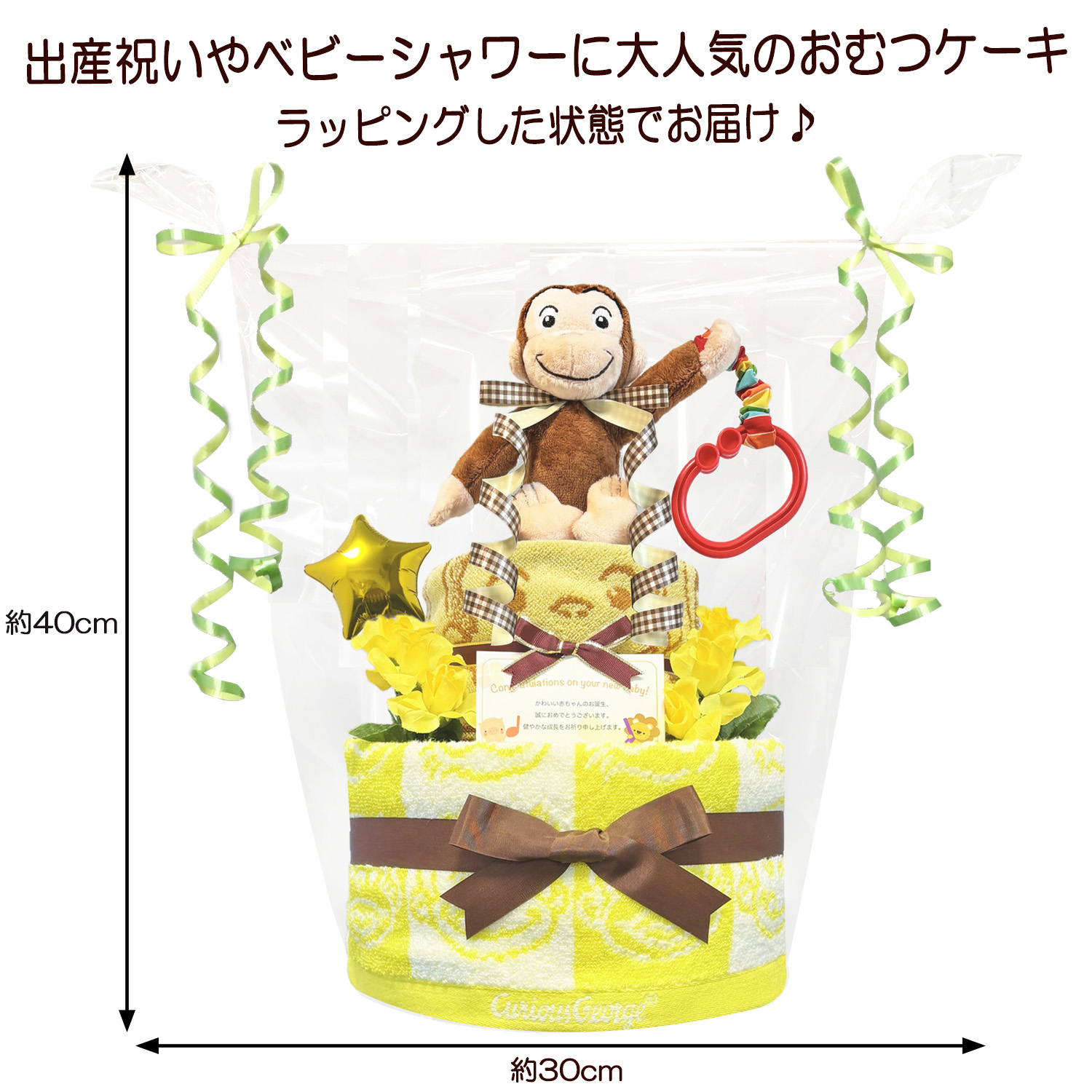 子供達に大人気のおさるのジョージのタオルやぬいぐるみなどを1つ1つ丁寧に手作りされたおむつケーキのギフトです♪ 大人気のおさるのジョージとパンパースの組み合わせで豪華なおむつケーキになっております。出産祝いやお誕生日プレゼントに大変喜ばれるギフトです。 ギフト用にラッピングを施し、可愛いギフトボックスにお入れしてお送りいたします。 おむつケーキに使われているおむつはお届け先の赤ちゃんやお母様にも安心していただける様に、衛生面にも考慮し、手を洗った後に手袋を着用し、1枚1枚個別包装してありますので、ホコリや湿気をしかっりガードいたします。 そのままお出かけにも持ち運べます。 ご購入していただいたお客様に満足して頂くことはもちろん、贈り先の赤ちゃんやお母さん、お父さんの幸せを願ってお作りいたしております。 |