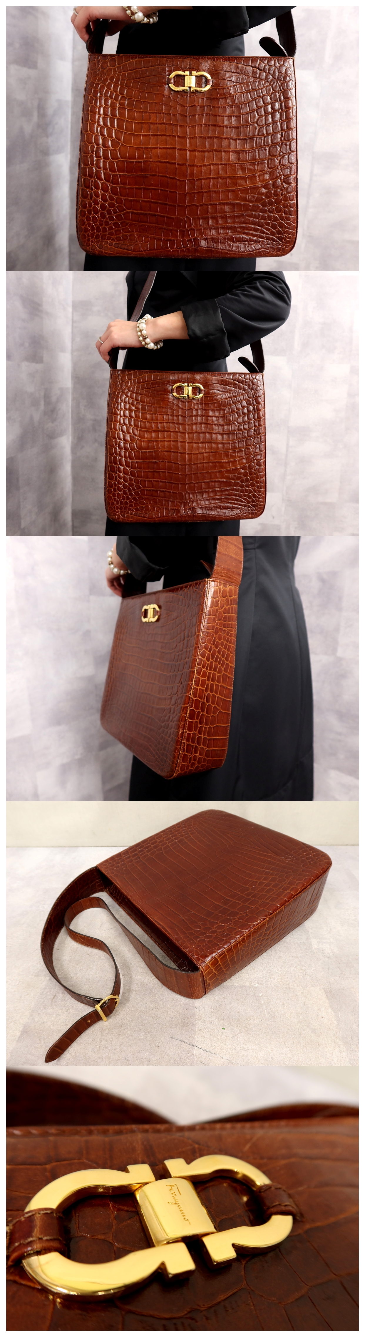 ●超美品●Salvatore Ferragamo フェラガモ●ダブルガンチーニ●クロコダイル 型押し レザー●ショルダー バッグ●ブラウン●B5●Js64483 收藏
