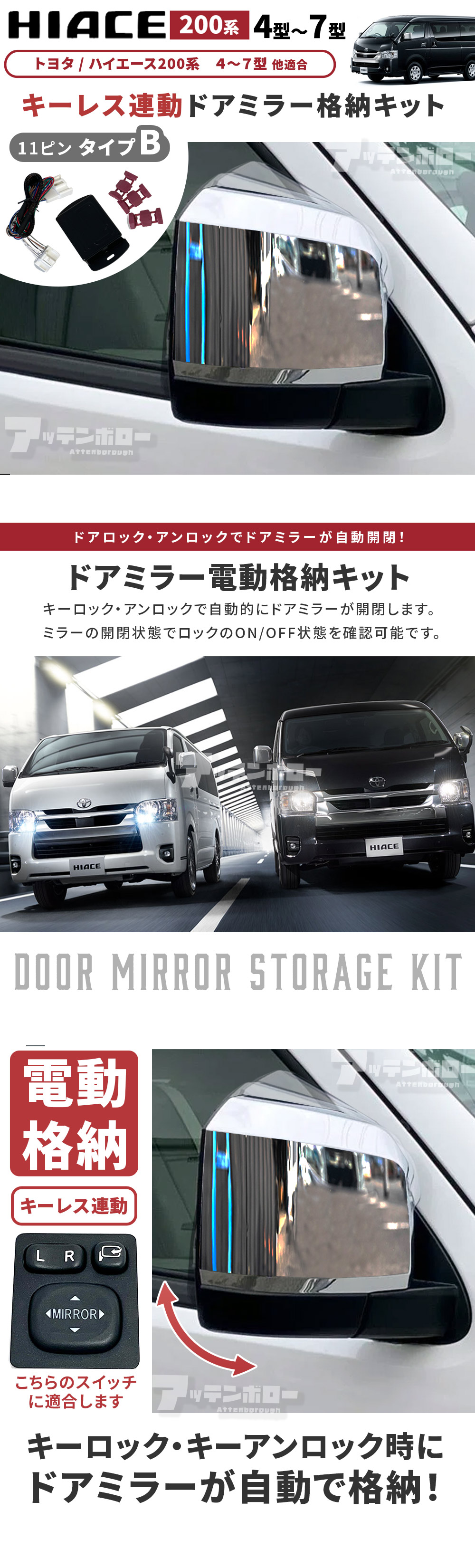 ハイエース 200系 4型 5型 6型 7型 ドアミラー キーレス連動 自動格納 オート格納ユニット カプラー仕様 11ピン Bタイプ 收藏