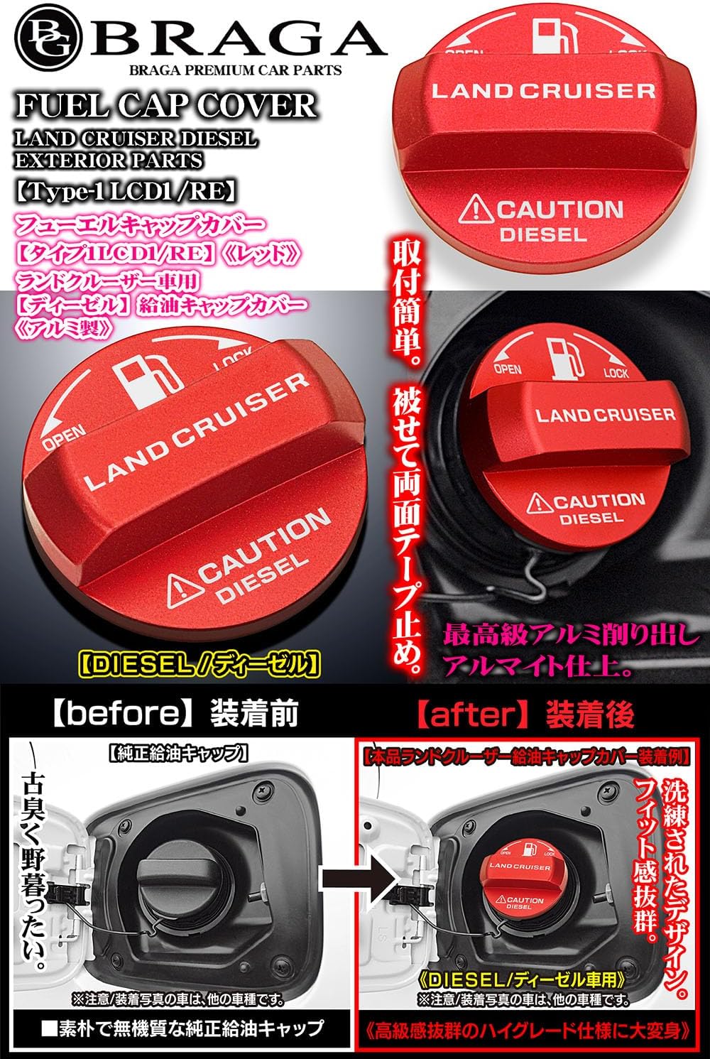 ランドクルーザー/ディーゼル1[タイプ1LCD1/RE]LAND CRUISERステッカー/DIESEL/給油フューエルキャップ カバー/レッド/アルミ製/ブラガ 收藏