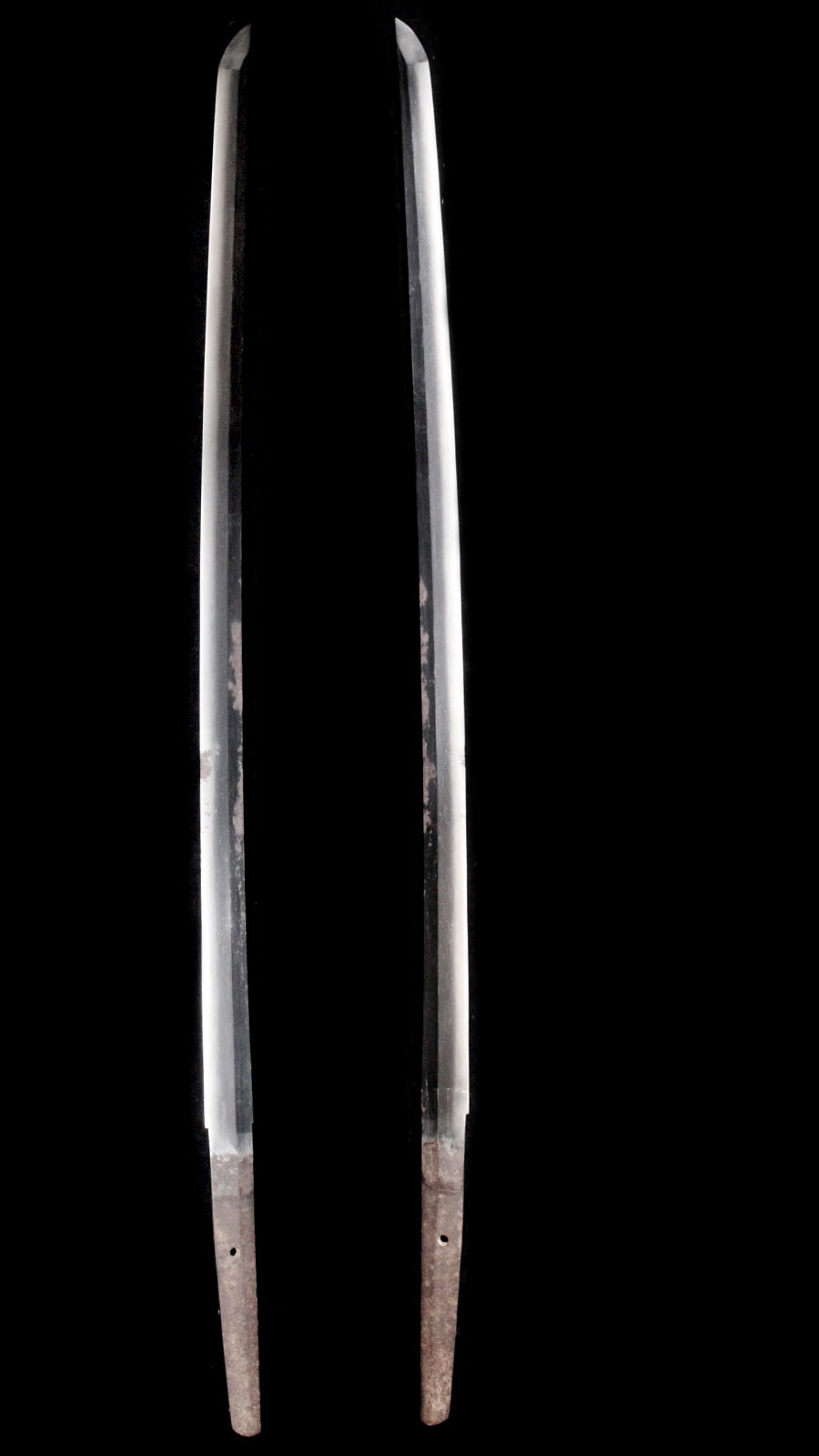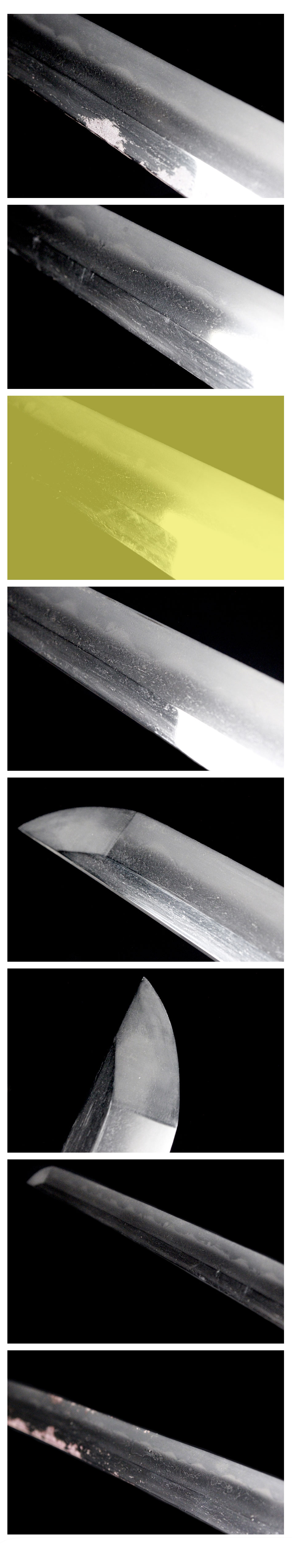 刀身長:約71.8cm 反り:約0.7cm 目くぎ穴:1個 元幅:約33.1mm 元重:約7.4mm 先幅:約21.6mm 先重:約5mm 刀身重:約872g 棟:庵棟 ハバキ:銅 |