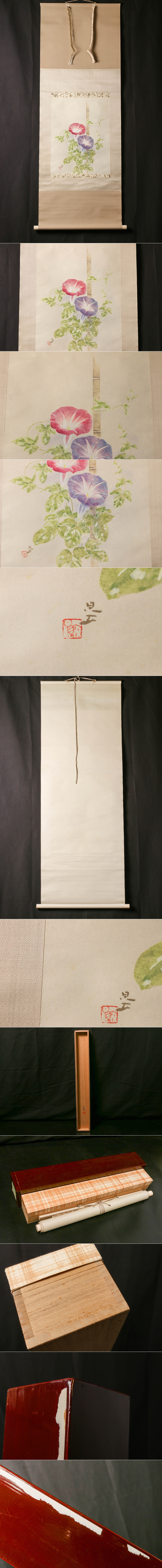 【SAG】沼田晏宏 『朝顔』日本画 紙本 肉筆 落款 掛軸 共箱 二重箱 本物保証 收藏