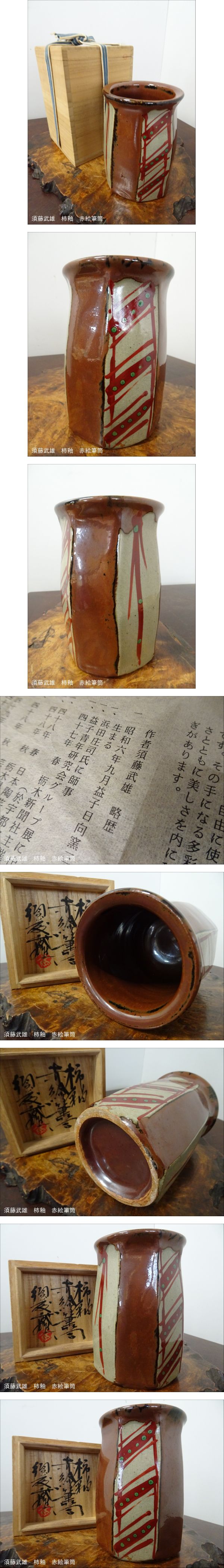 美品 益子焼 須藤武雄 柿釉 赤絵筆筒 栞 共箱 /書道具/茶道具 | |||||||||||||||||||||||