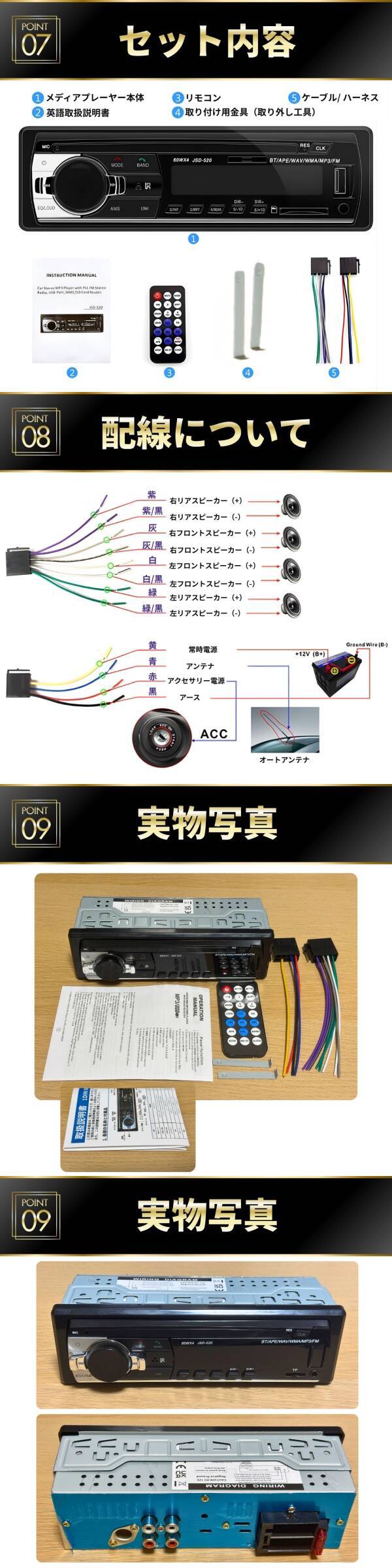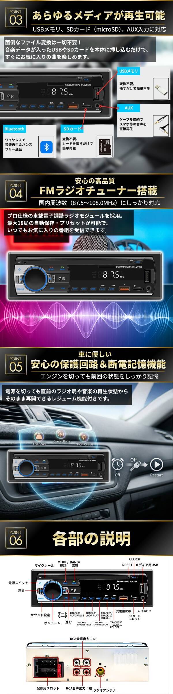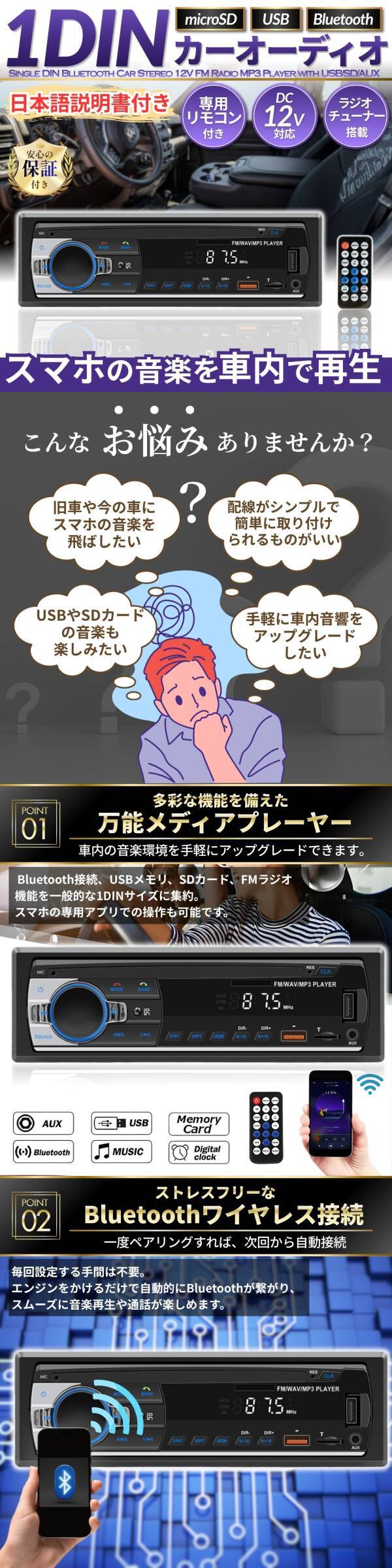 | ■商品仕様・特徴 ・対応機能:Bluetooth、USB、SD(microSD)、AUX入力、FMラジオ ・対応オーディオ形式:MP3 / WMA ・FMラジオ周波数:87.5~108.0MHz(18局プリセット対応) ・電源電圧:DC12V(11~16V)※24V車には対応しておりません ・本体サイズ:横幅188mm × 奥行77mm × 高さ58mm(設置寸法:横幅178mm × 奥行150mm × 高さ50mm) ・安心設計:過負荷・過電圧・短絡保護テスト済み、断電記憶(レジューム)機能搭載 ・その他:車載用LEDディスプレイ(見やすく柔らかな表示) ■セット内容 ・カーオーディオ本体 ・専用リモコン(※電池は付属しておりません) ・電源、スピーカーケーブル ・取り外し用金具 ・取扱説明書(英語) ・オリジナル日本語取扱説明書 | |||