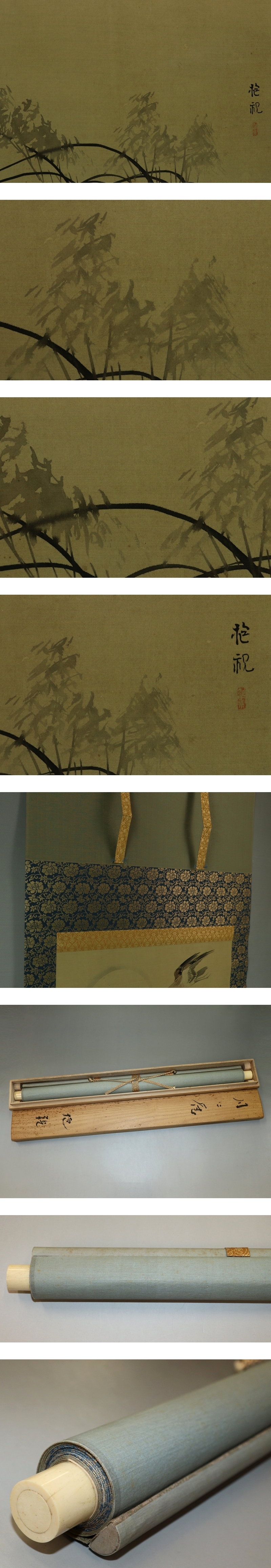 酒井抱祝(1878-?) 明治~大正・昭和初期に活躍した琳派画家。酒井道一の子。 名は唯一。酒井抱一系の画人。 江戸後期の琳派を代表する画家酒井抱一系の画家で 抱一の別号雨華庵を名乗り5世雨華庵を称した。 また、抱一をはじめ琳派画家の研究、鑑定にも力を入れた。 本紙は、染み、軽い汚れ、ヤケがあります。 表装は、軽い染み、軽い皺、軸先に汚れとヒビがあります。 【サイズ】 作品 横約47.5cm×縦約33cm 表装 横約60cm×縦約131cm |