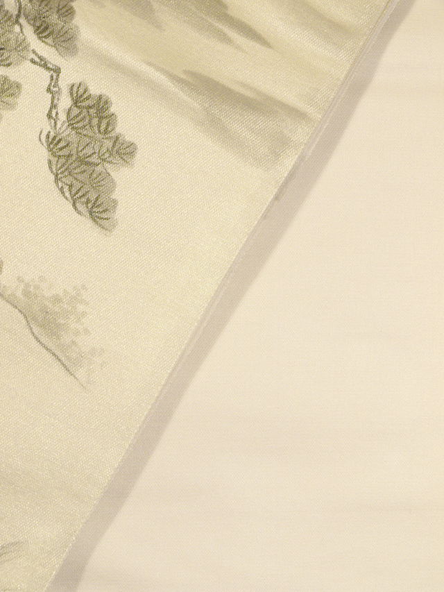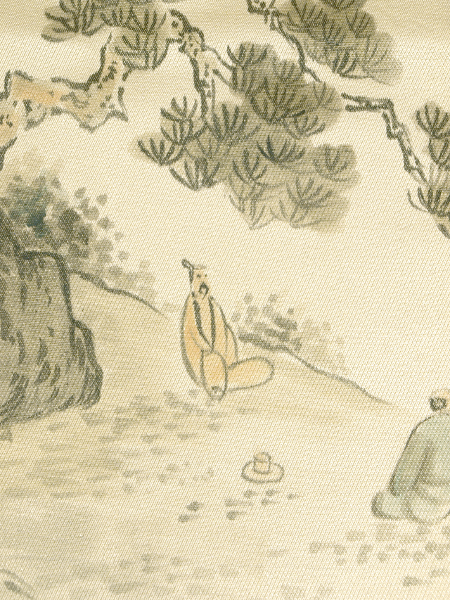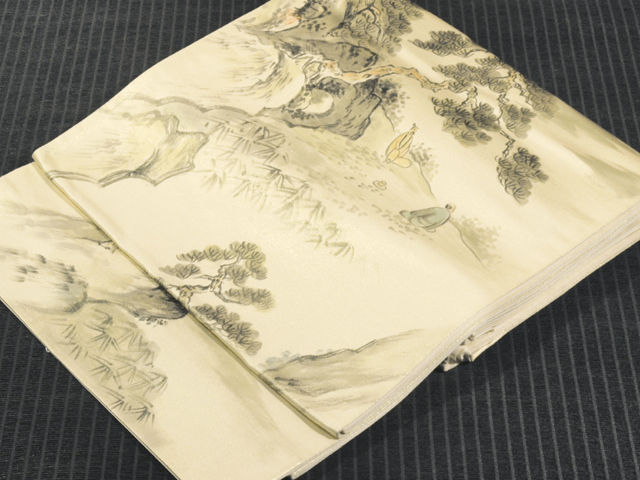ごく淡い薄金色の地に、山水の風景画の文様が染められている、 引箔の西陣織の袋帯です。 明治時代の日本画家「池田桂仙(桂仙逸士)」氏の山水画が意匠となっています。素朴でのどかな風情の感じられる情景に思わず微笑んでしまいます。帯芯を入れていないお仕立てになっているので、軽めの帯がお好みの片におすすめです。 ユーズド品で、前の折り跡がごくごくうっすらとありますが、使用感はあまり感じられません。ごくこまかな箔糸の凹みやしわがちらほらとありますが、気になるようなものではありません。そのほかに目につくしみやよごれなどのダメージはなく、きれいな状態です。 |