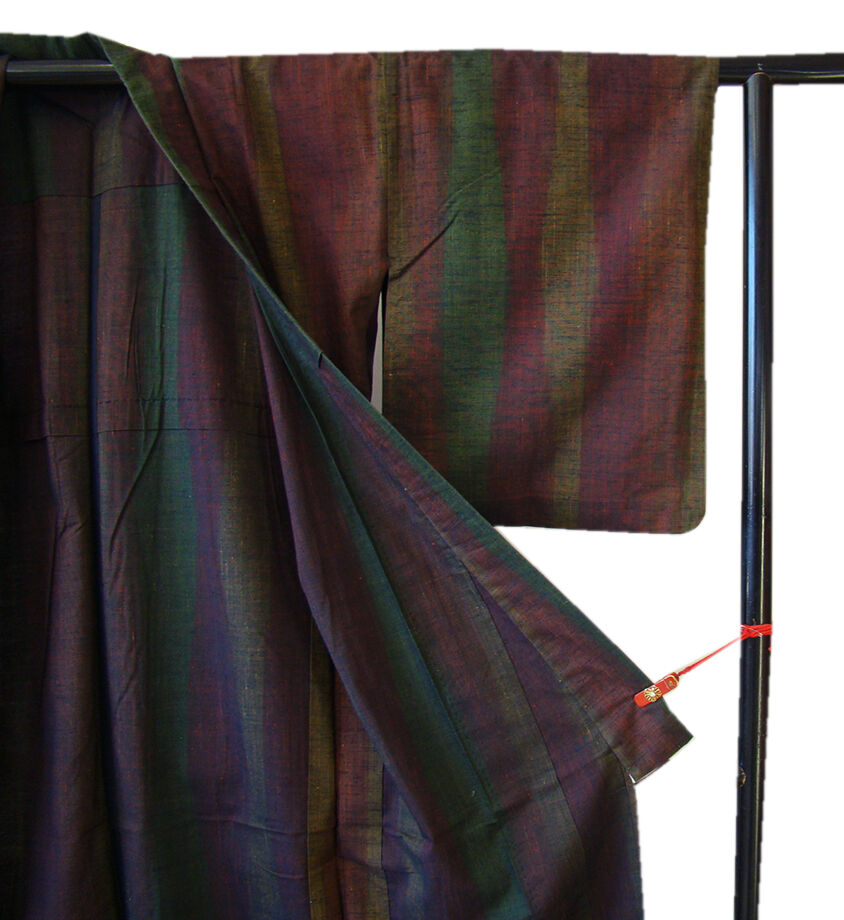 | 商品説明 | こちらのお品は「単衣」ですので5月、6月、9月にお召頂ければと思います。 着物には、大きく分けて「袷(あわせ)の着物」と「単衣(ひとえ)の着物」と「夏着物」があります。 反物(表地)を着物に仕立てるときに、裏地類をつけるものを袷の着物、 つけないものを単衣の着物と呼び、胴裏や八掛といった裏地がつかない一枚ものの着物です。 また裏地がないため、座る時などにヒップのラインが目立たないよう、 居敷当て(いしきあて)の生地をつけることもあります。 居敷当ては付いておりません。 しなやかでさらりとして手触り良く着心地良い涼やかな風合いの十日町紬地、 渋井赤、緑、黒、黄色等の変り縞の織柄が洒落感高い着物姿を演出しております。 また、バチ衿仕立てとなっております。 |