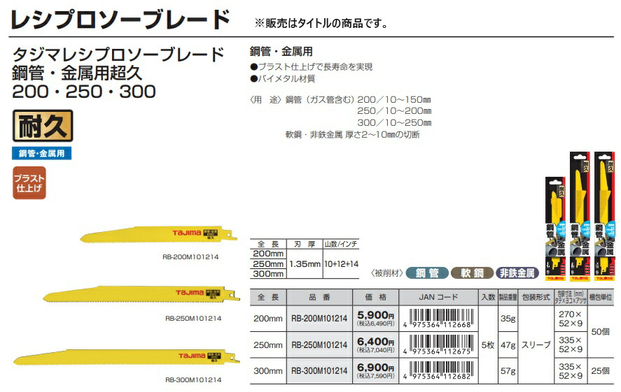 タジマ レシプロソーブレード鋼管・金属用超久300 RB-300M101214 コンビ刃 TJMデザイン TAJIMA 112682 收藏