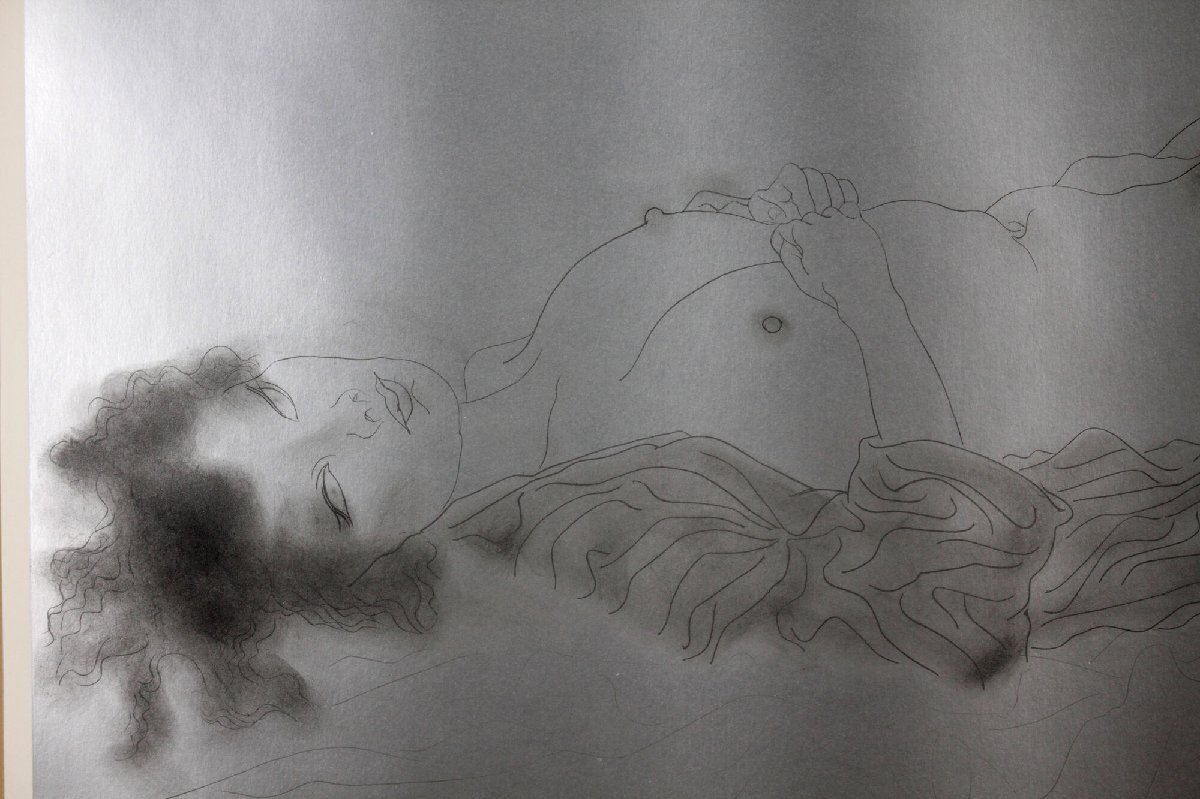 光沢あるシルバーの背景が揺らめくなかに横たわる艶かしい裸婦像
