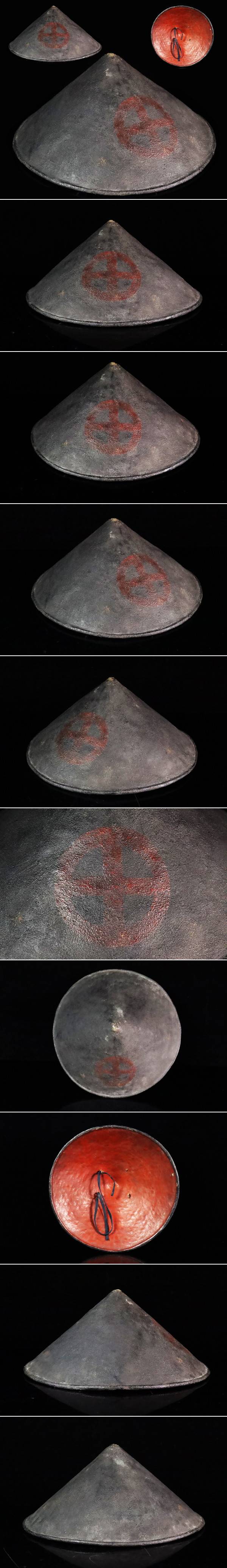 時代 鉄地 黒漆塗陣笠 トンキョ帽 丸に十字家紋入 鉄打ち出し 鎧 兜 甲冑[72204r] 收藏
