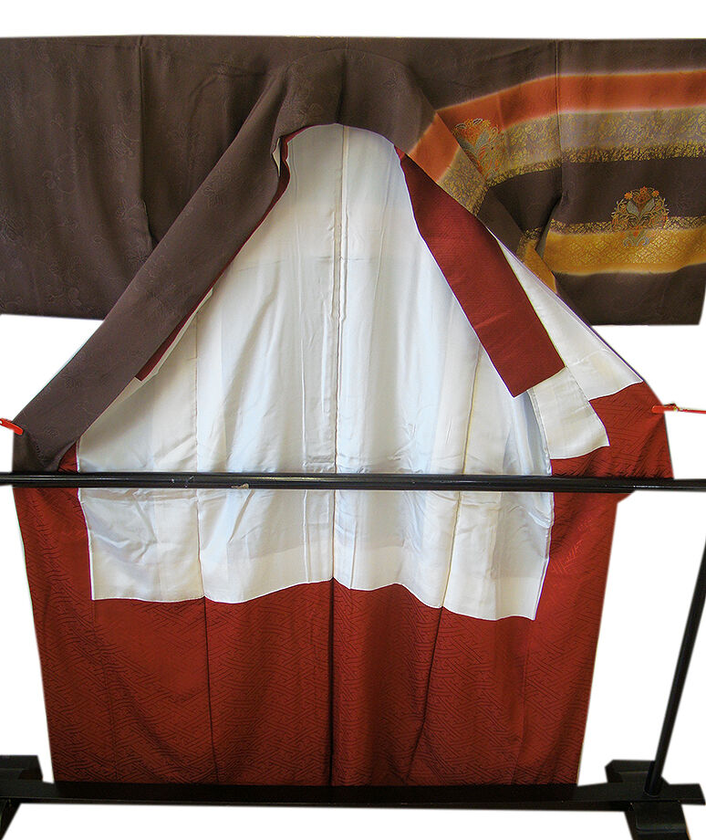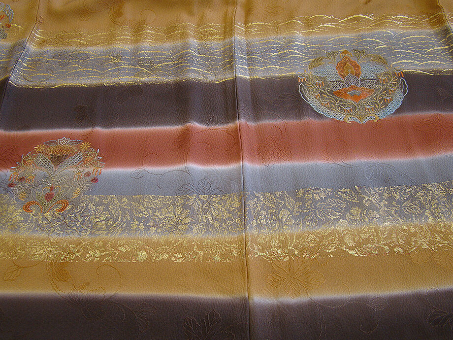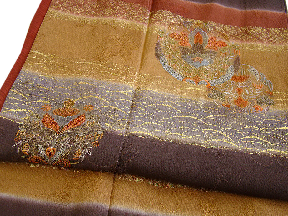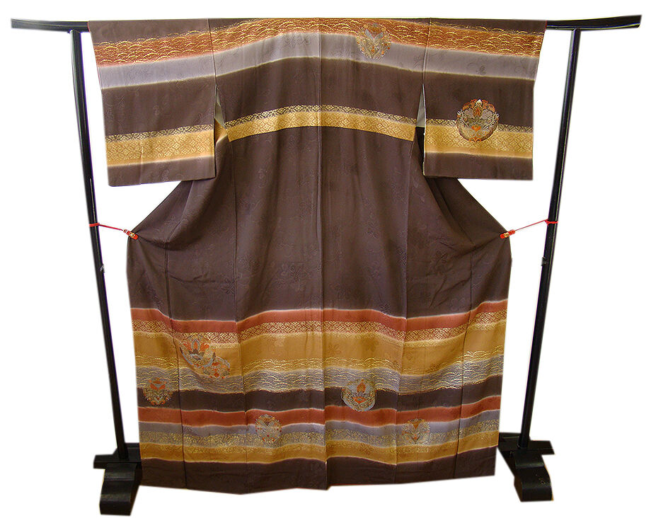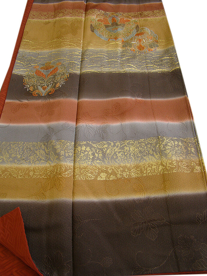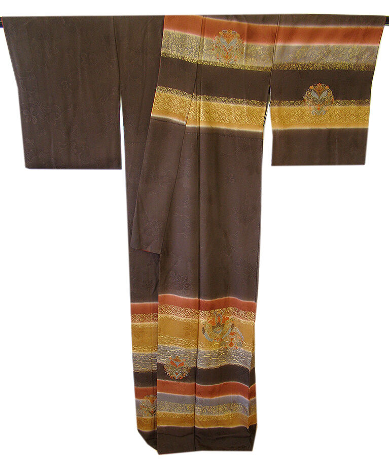 | 商品説明 | こちらのお品は「袷」ですので10月から5月までお召頂ければと思います。 しなやかで柔らかな手触りの着心地良い重めの紋意匠地の生地、 こげ茶色、赤茶色、黄土色の横断に地模様入りに花草柄の豪華な金彩加工染に刺繍入り、 八掛は渋い紅鳶色に地模様入り(正絹)、重ね衿付き、幅広い年代の方にお召頂けます。 |