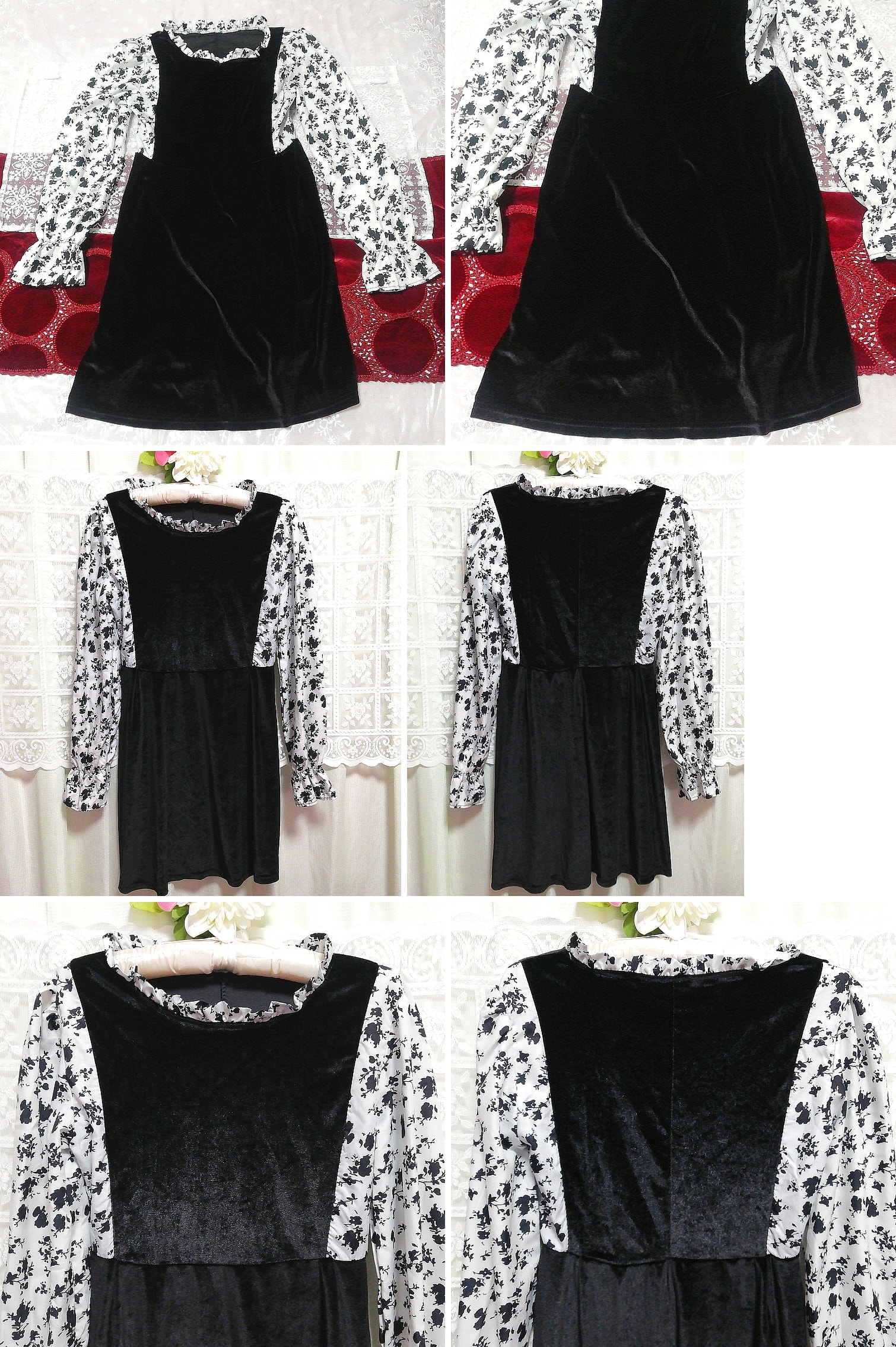 黒ベロア白黒花柄袖チュニックネグリジェ Black velour white black floral print sleeve tunic negligee