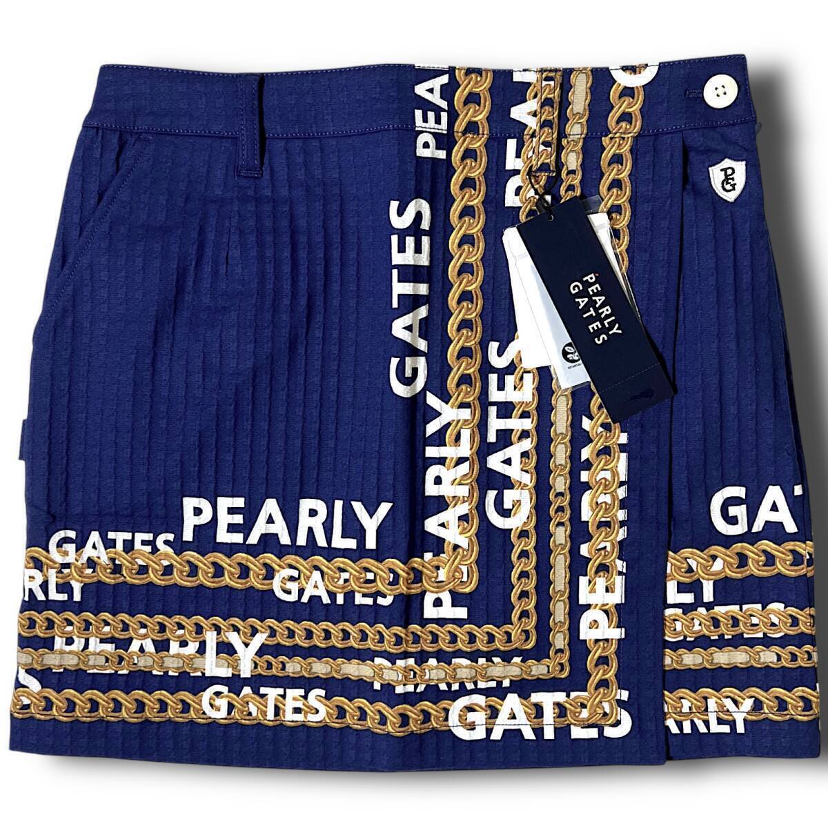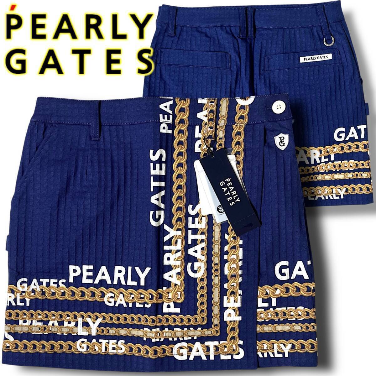 タイトル 新品 PEARLY GATES パーリーゲイツ 定価3万 速乾通気性 シアサッカー調 チェーンロゴ柄 総柄 ストレッチ ミニ スカート ゴルフウェア レディース GOLF スポーツ レジャー 普段使い タウンユース カジュアル 春夏秋 ネイビー系 3127