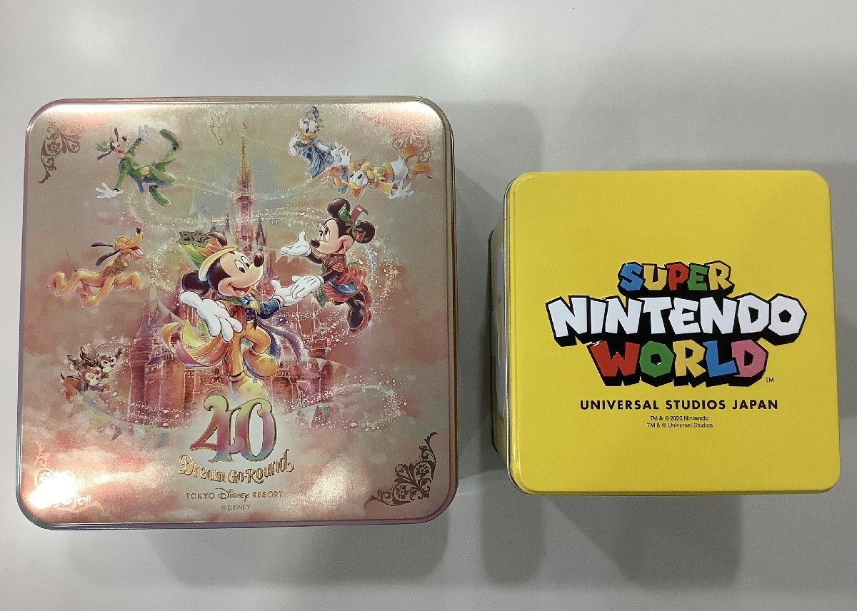 お菓子の缶と、ディズニー40周年記念で販売されていたおせんべい缶のセット販売となります。