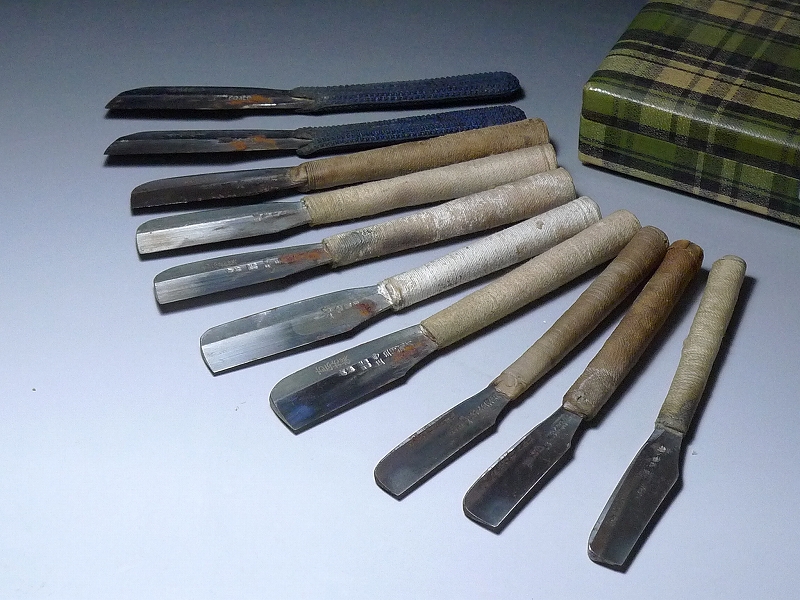 6026H03*8B▲理容具 日本剃刀 カミソリ へんこつ/正寺 玉鋼別打 /日本刀打実雄作 兼久金文字 ?10丁セット和剃刀 髭剃り 理美容品 收藏