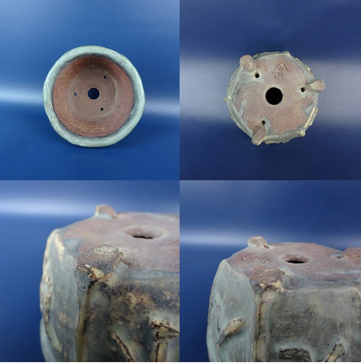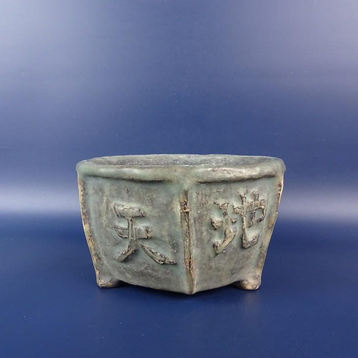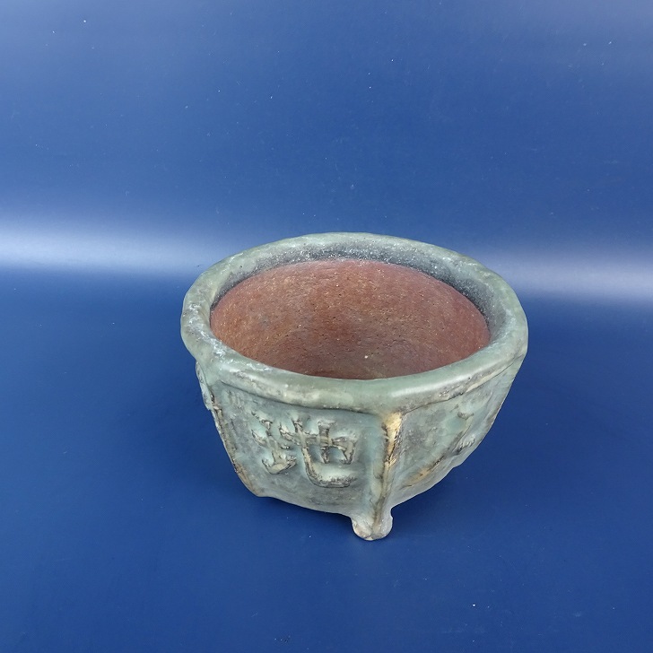 【中古】盆栽鉢 落款あり 小型 長辺 約 12cm 丸鉢 浮彫 文字 釉薬 中国鉢 現品 中古鉢 收藏