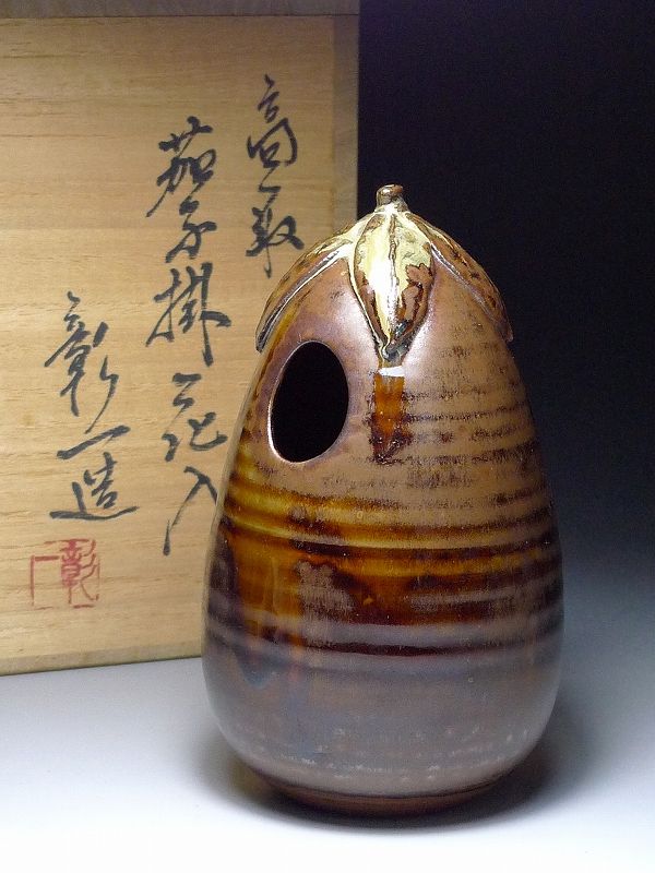 60HT135★高取焼 元永彰一造 茄子掛花入 共箱 一輪挿し 花器 花入 茶道具 華道具 陶磁器 陶芸 工芸 11円 收藏