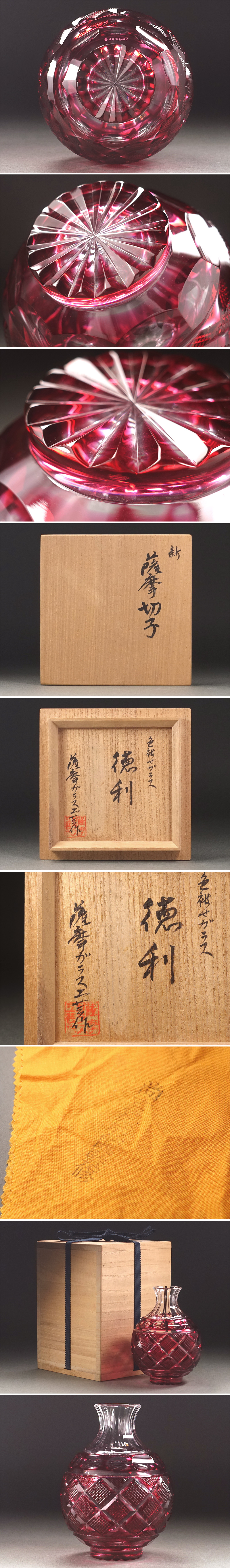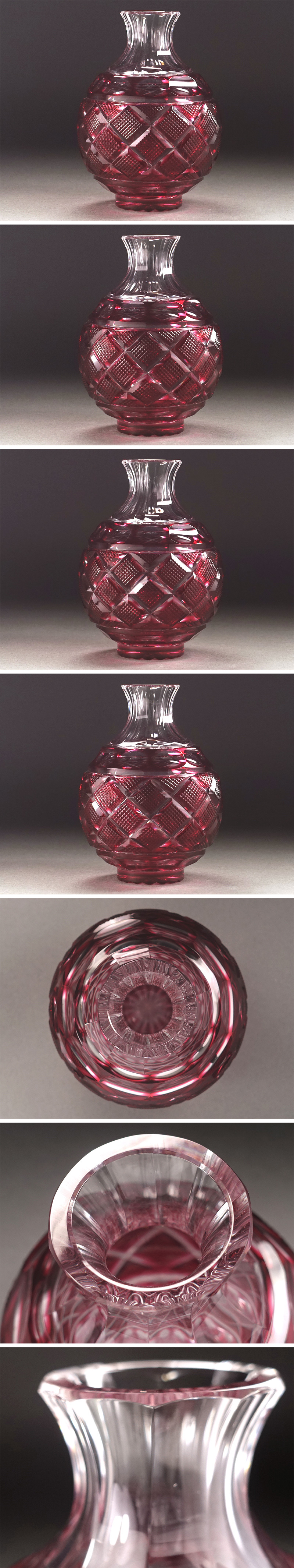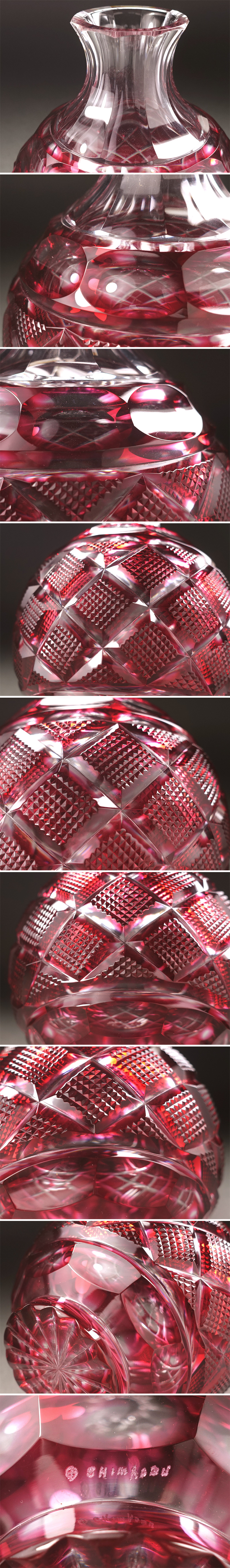 ∇花∇尚古集成館監修【薩摩ガラス工芸】作 復刻島津薩摩切子 金赤被せ切子硝子徳利 矢来魚子文酒器 共箱付 收藏