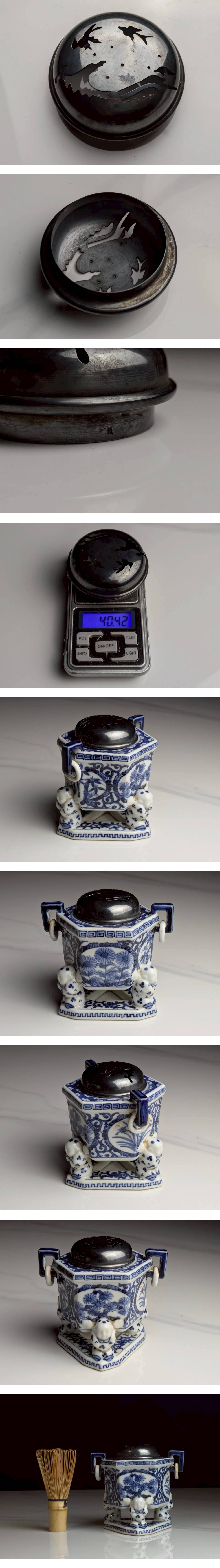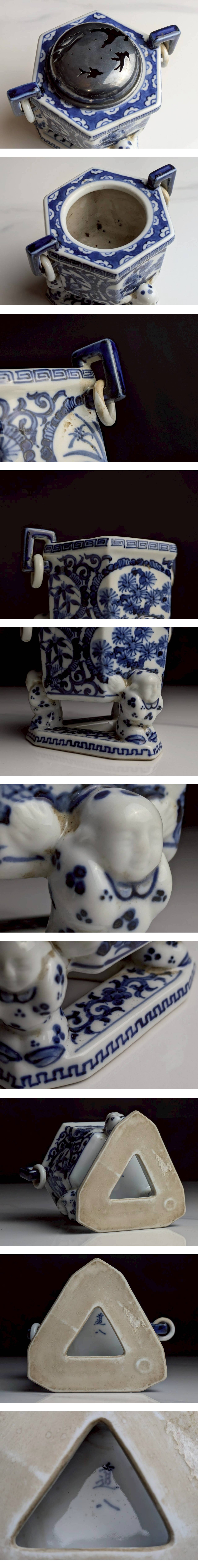 時代物 華中亭 道八 造【三足唐子染付香炉 純銀蓋】細密絵付 日本伝統美術品 骨董品 蓋40g 希少品 收藏