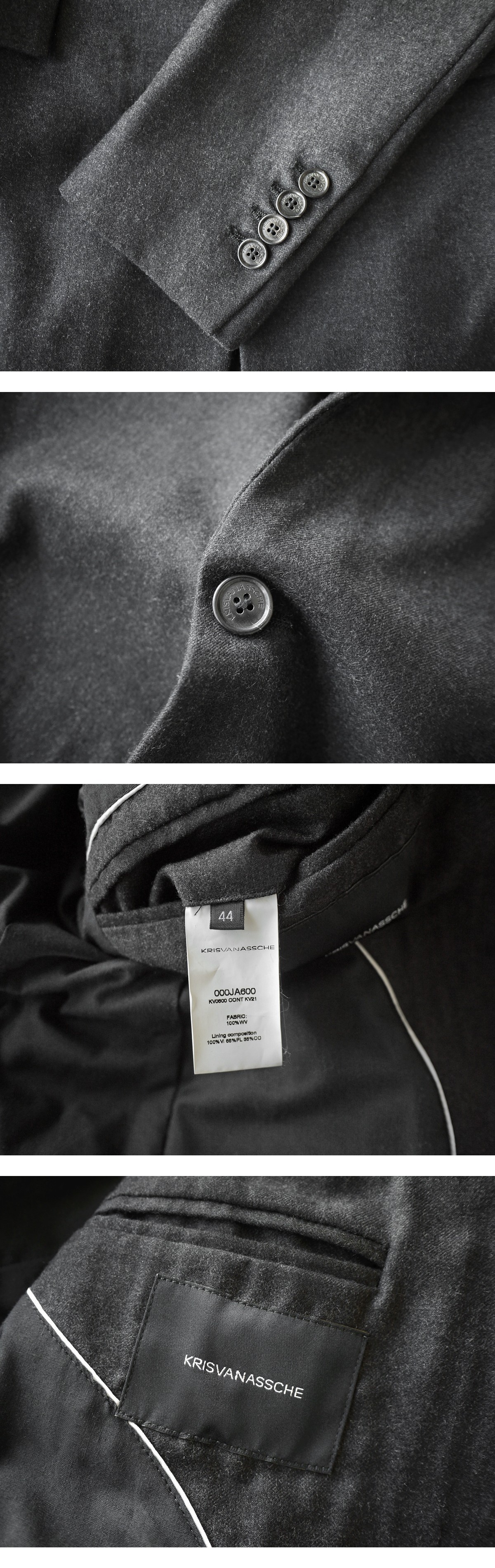 前ディオールオムクリエイティブディレクターを務めるクリスヴァンアッシュのフラノウールセットアップスーツでございます。エディの意思を継いでいるクリスだけに、洗練されたカッティングで着用時のシルエットは大変美しくまさに非の打ちどころのないプロポーションです。ジャケット単体でもお使いいただける洗練されたカッティングで、一般のスーツとは一線を画すデザインセットアップとお考えいただければと思います。