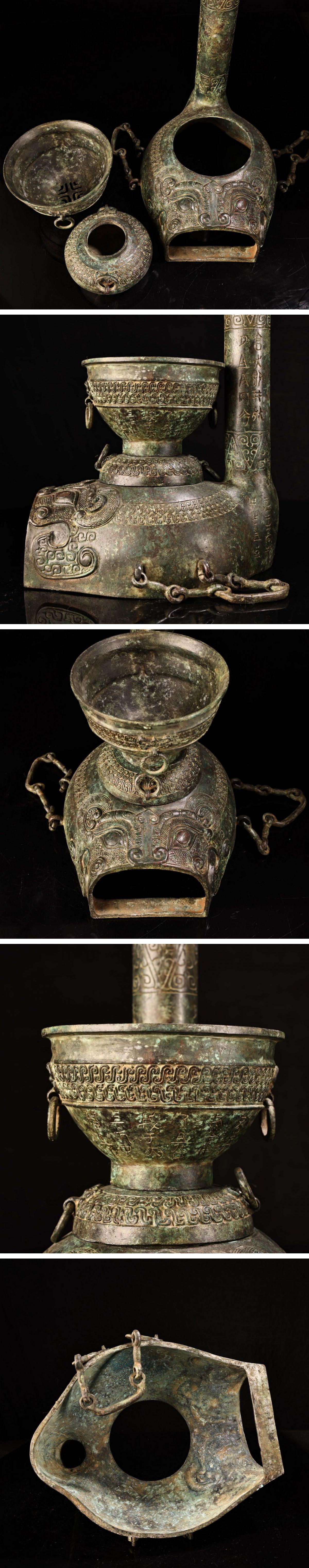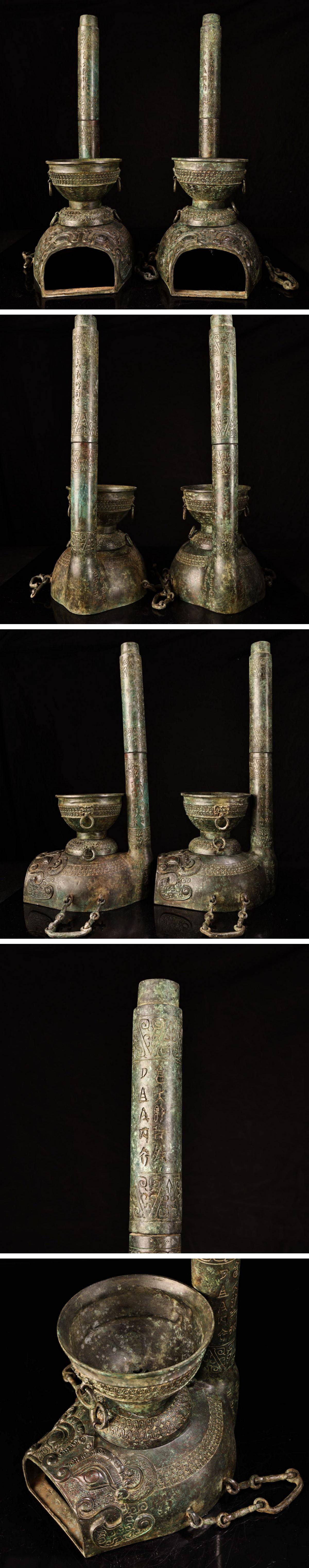【清】某有名オークション購入 戦漢時代 青銅器 獣面紋灯台一双 材質保証 古置物 古擺件 古美術 時代コレクション7L9-IH 收藏