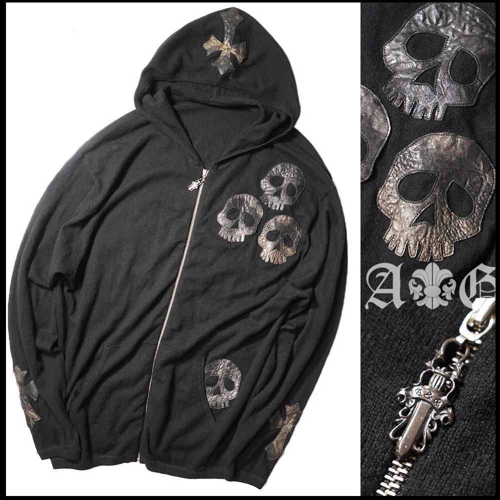 希少90’s【 A&G AMAL GUESSOUS アマールゲソウス】スカルクロスレザーパッチ/シルバー925 ダガートップ/100%カシミアニットパーカーXL 收藏