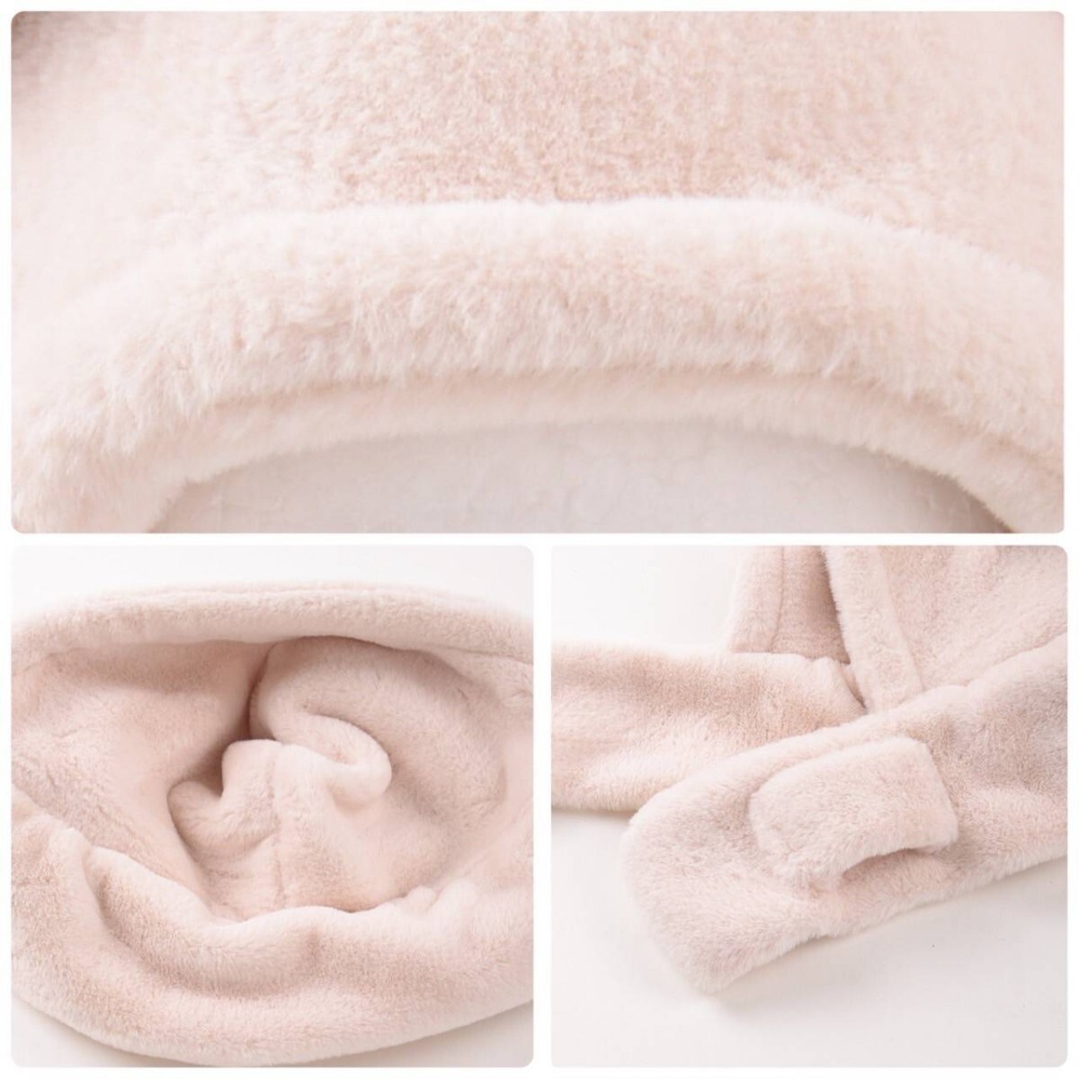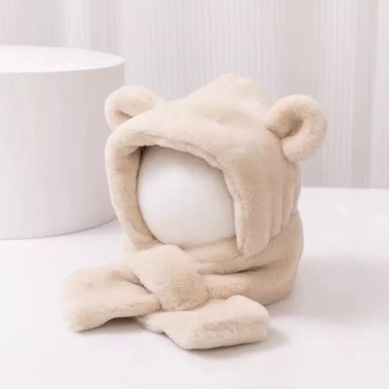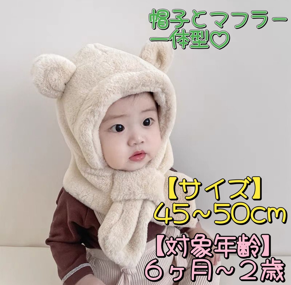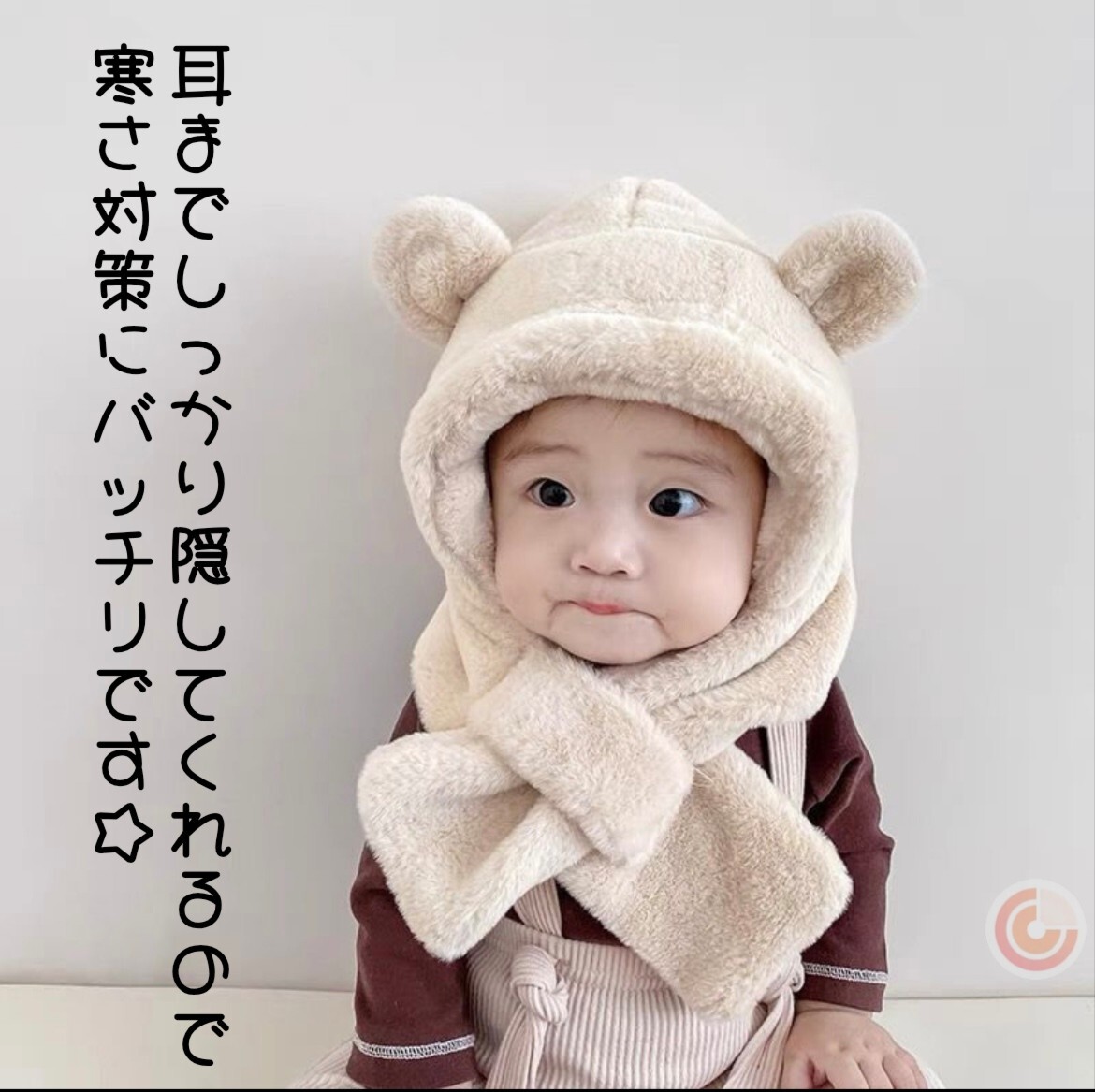 【寒さ対策】アイボリー 防寒 ベビー キッズ くま耳 散歩 おでかけ マフラー 帽子付き 帽子 ふわふわ 可愛い ニット帽 冬 收藏