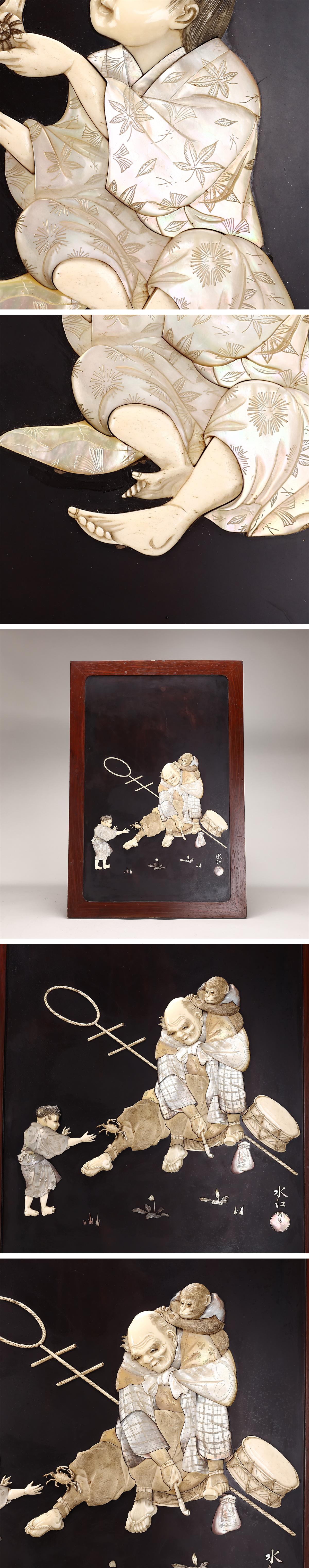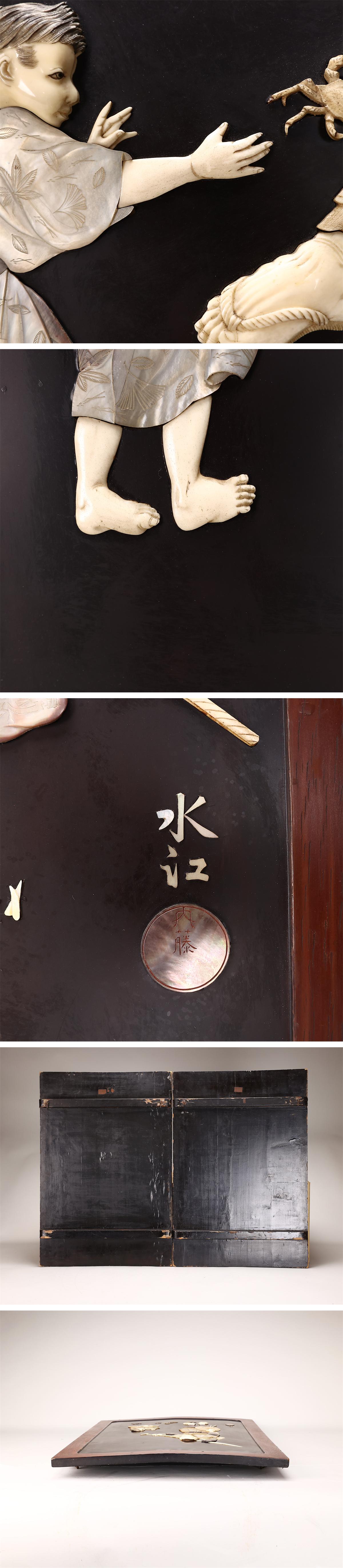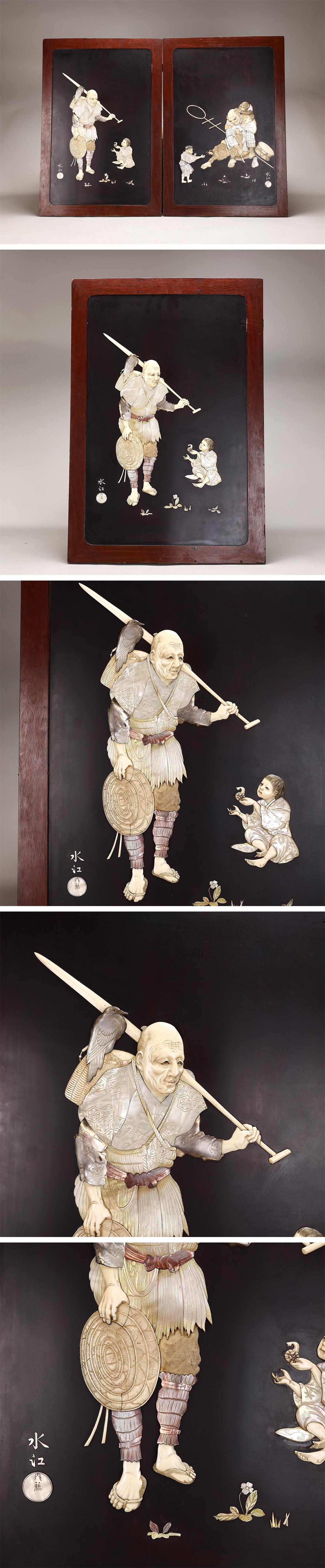 【吉】ZD575 江戸時代 東洋彫刻 水江 内藤銘 【芝山象嵌】 極細工 人物紋 壁掛 壁飾 2点 一対 幅77×52.5㎝/本物保証 美品GZ! 收藏