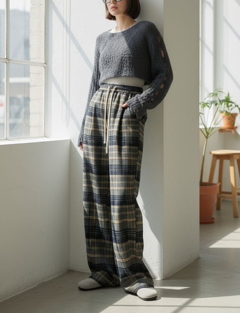 ゆったり 着心地がいい あったか もこもこ 黄色灰色 チェック ワイドパンツ 大きいサイズ 裏起毛 秋冬 トラッド イージーパンツ 收藏