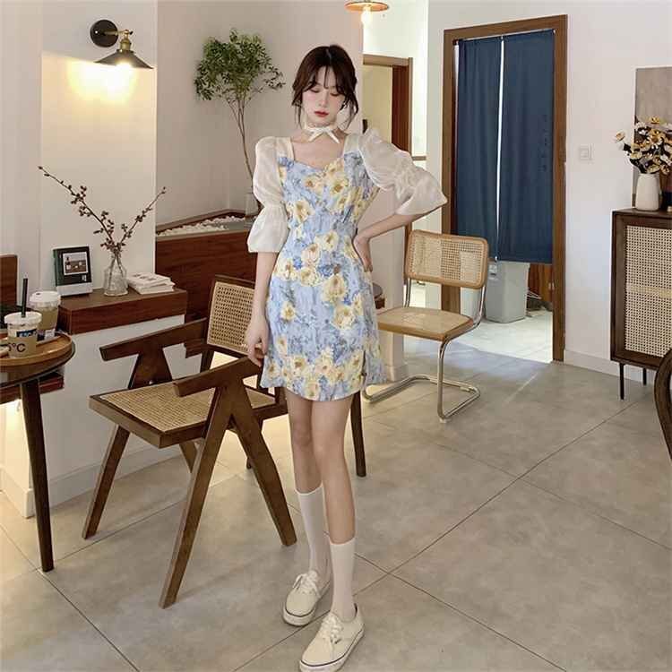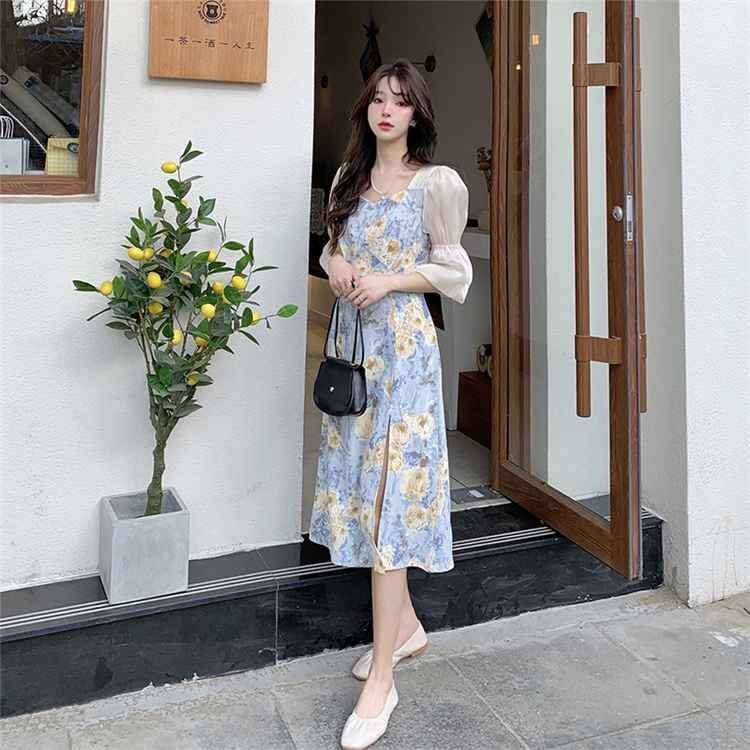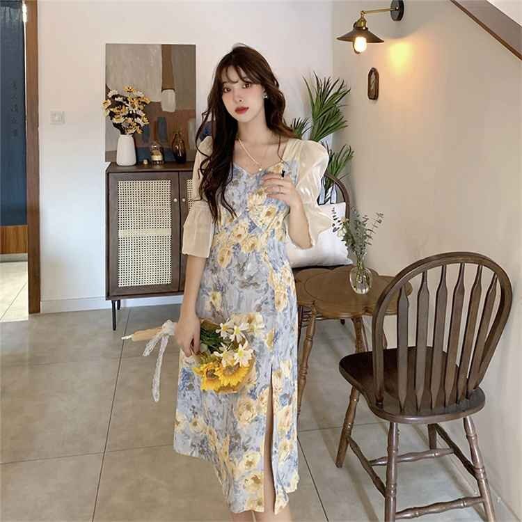 かわいい系 縫付生地 プリント スプリット ショート丈 ロング丈 ワンピース 花柄 S ショート丈 收藏