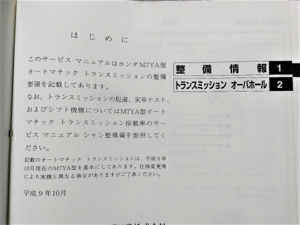 | ホンダ サービスマニュアル M7YA オートマチックトランスミッション整備編 97.10(YDE758052) | ||||