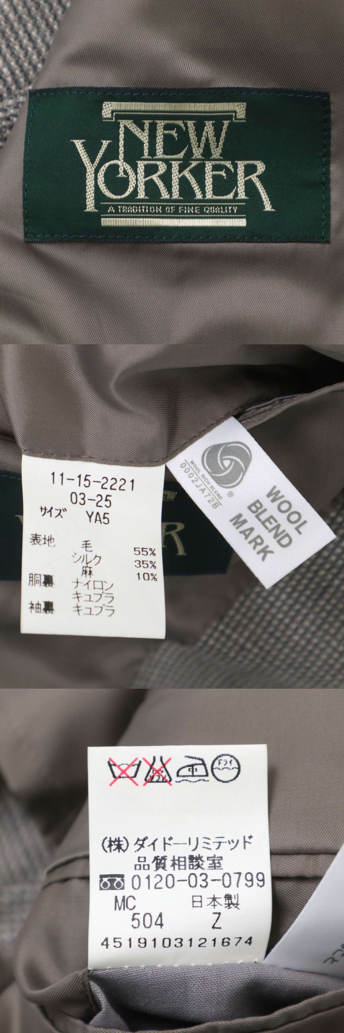 NEWYORKER ニューヨーカー 秋冬 背抜き シルク混★ ウール テーラード ジャケット Sz.YA5 メンズ 日本製 收藏
