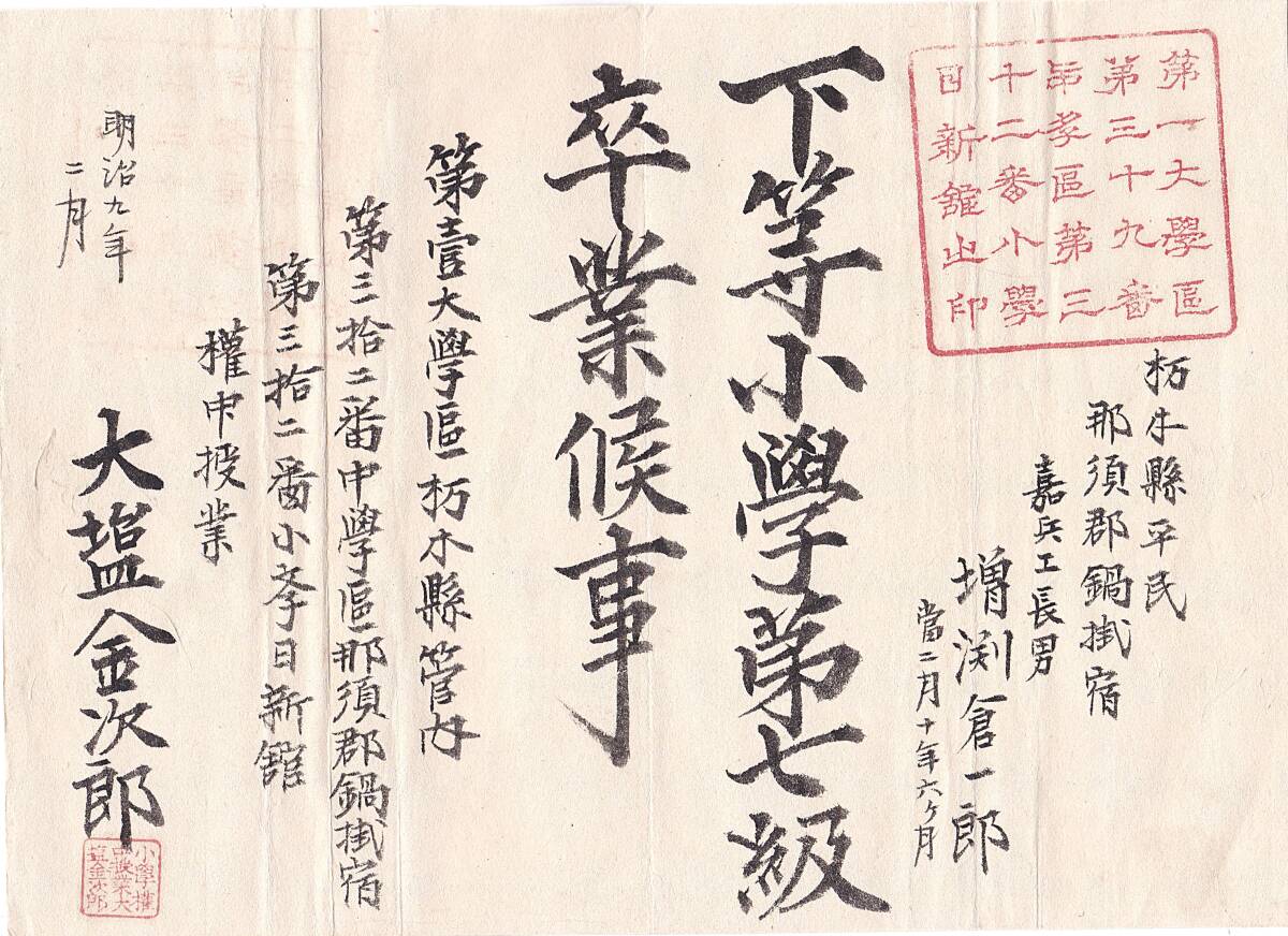 | 明治6年3月奥州道中鍋掛宿(下野那須郡/現栃木県那須塩原市)内の正観寺を借用、「日新館(校名は初代訓導に就任した旧会津藩士野村木哉の命名,会津藩の藩校日新館に由来する)」として創立した小学校(現栃木県那須塩原市立鍋掛小学校)関係の刷物など6点一括 明治初期 すべて鍋掛宿の旧家増渕家の当主増渕嘉平の長男倉一郎宛の下等小学校第8~3級卒業証書(現在の各学年の修業証書に類するもの)揃 画像③下等小学校第8級卒業証書 明治8年初代訓導(教頭)野村木哉 肉筆墨書朱印(第一大学区第三十九番中学区第三十二番小学日新館之印&小学教頭野村木哉印)実捺 画像④下等小学校第7級卒業証書 明治9年2代訓導(権中授業)大塩金次郎 肉筆墨書朱印(第一大学区第三十九番中学区第三十二番小学日新館之印&小学権中授業大塩金次郎)実捺 画像⑤下等小学校第6級卒業証書 明治9年2代訓導(権中授業)大塩金次郎 肉筆墨書朱印(第一大学区第三十九番中学区第三十二番小学日新館之印&小学権中授業大塩金次郎)実捺 画像⑥下等小学校第5級卒業証書 明治10年3代訓導(4等訓導)小室重弘 木版+肉筆墨書朱印(第一大学区第三十九番中学区第三十二番小学日新館之印&重弘)実捺 画像⑦下等小学校第4級卒業証書 明治11年4代訓導(4等訓導)赤平良助 木版+肉筆墨書朱印(第一大学区四十番中学区公立日新館小学校印&良輔)実捺 画像⑧下等小学校第3級卒業証書 明治12年4代訓導(4等訓導)赤平良助 木版+肉筆墨書朱印(第一大学区四十番中学区公立日新館小学校印&小学四等訓導赤平良助之印)実捺 以上6通一括 初代訓導の野村木哉は旧会津藩士、会津藩の藩校「日新館」で漢学を学び、戊辰の役では前線で戦い九死に一生を得る、維新後は栃木と福島の両県で教員を勤めた教育者 「日新館」の離任後は会津に戻り猪苗代小学校校長等を歴任 3代訓導の小室重弘(1858~1908)は旧宇都宮藩士、安政5年旧宇都宮藩の江戸藩邸で生、若くして漢籍を修め、維新後は「日新館」で訓導を勤める、のち同じ那須郡の佐久山宿(現大田原市)で自由民権運動ののろしを上げる 田中正造の要請で栃木新聞幹事に就任、栃木県会書記となり、国会開設運動に加わる 以後各地の新聞社で主筆等を勤め、明治27年第3回衆議院議員選挙で愛知県第2区に自由党より出馬し初当選その後連続3期在任、自由民権運動を終始リードしたジャーナリスト また屈山と号し新体詩人としても活躍「自由の歌」で一世を風靡した 維新後すぐの小室の動向は不明な点が多く本史料は貴重 |