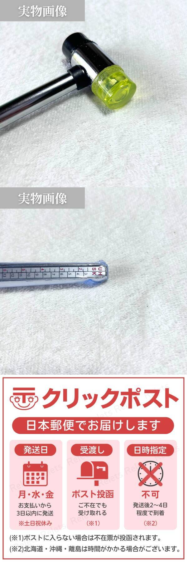 | 商品説明 | ご覧いただきありがとうございます! ●商品説明 アクセサリーをネットで購入される方や、シルバークレイを使ったハンドメイド制作をされる方におすすめのツールセットです。 ご自宅で手軽にサイズ測定や調整作業が行えます。 ●商品内容 【リングゲージ】 ・1号から28号まで対応しており、プロユースにも適した仕様です ・ワイヤー接続部分は簡単に取り外し可能。各リングを個別に取り外して、実際に指にはめてサイズ確認ができます ・コンパクトサイズで、収納や持ち運びにも便利 ・それぞれのリングには号数が刻印されているため、万一バラけても混乱なく使用できます。 ・サプライズで指輪を贈る際にも、相手に気づかれずにサイズを確認できる便利なアイテムです 【リングゲージ棒】 ・日本の標準規格に準拠し、1号から34号までの測定が可能 ・スチール製で高い精度を保ち、錆びや破損の心配がありません ・曲がった指輪の修正や、ハンドメイドリング製作時の芯棒としても活躍します 【2WAY ハンマー】 ・ゴム製と樹脂製の2種類のヘッドを使い分けることで、素材に合わせた加工が可能 ・リングの形状修正や、ハンドメイドアクセサリーの製作時に役立ちます ●商品詳細 【サイズ】リングゲージ棒…全長約255mm、重量約180g 2WAYハンマー…全長約255mm、重量約180g リングゲージ…重量約70g 【セット内容】リングゲージ棒…1本 2WAYハンマー…1本 リングゲージ…1個 シルバー磨き:2枚 ●お支払い方法 !かんたん決済 ●発送について 【クリックポストで発送します】 発送日 :お支払い後1~3日以内 到着目安:発送後2~4日程度 ※商品はポストに投函されます ※遠方の方はもう少しかかる場合もございます 【配送方法の変更はできません】 ●注意事項 ・取扱説明書の付属はございません ・落札後は期限内にお支払いください ・商品画像の転載や説明文のコピーはお止め下さい 〇初期不良は対応しますので、何かあれば「取引完了前に」ご連絡下さい |