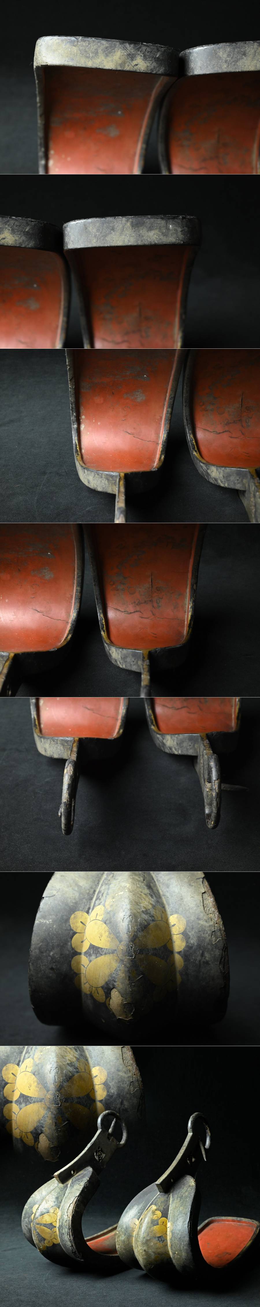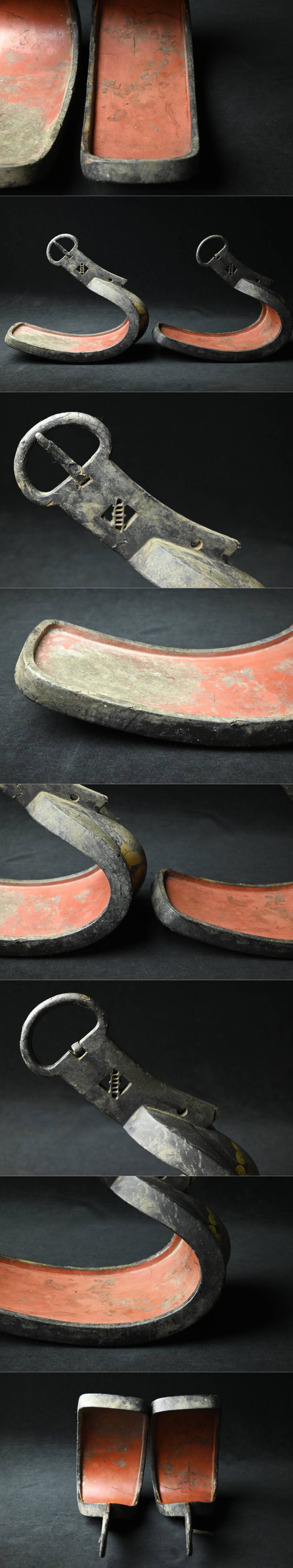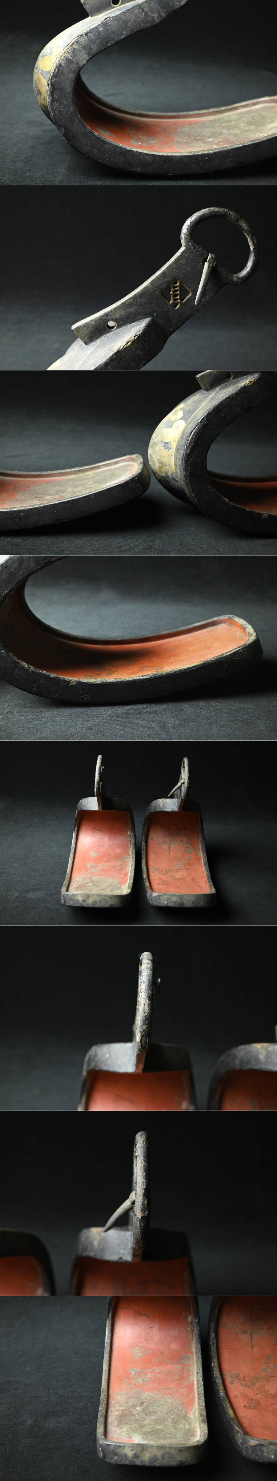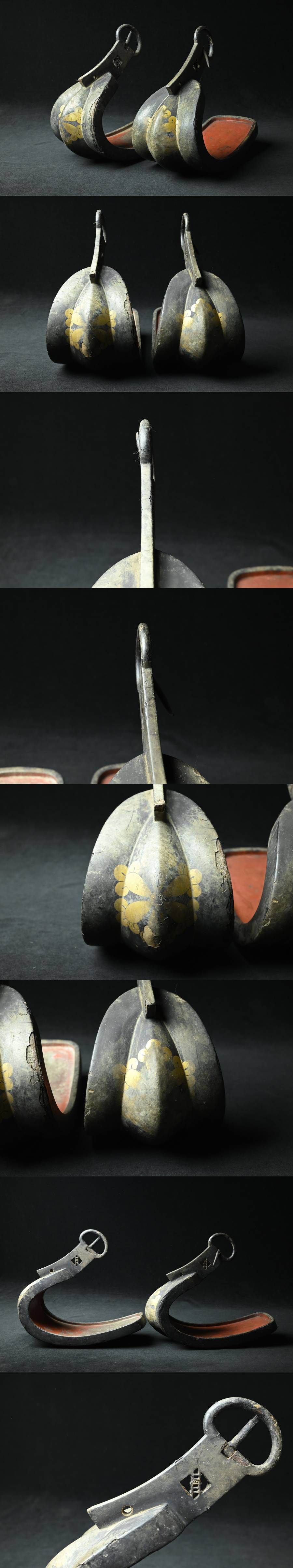【昊】江戸期 旧家所蔵品 大名家伝来 六つ丁子家紋 黒塗鐙一対 古式馬具[LK37Ui] 收藏