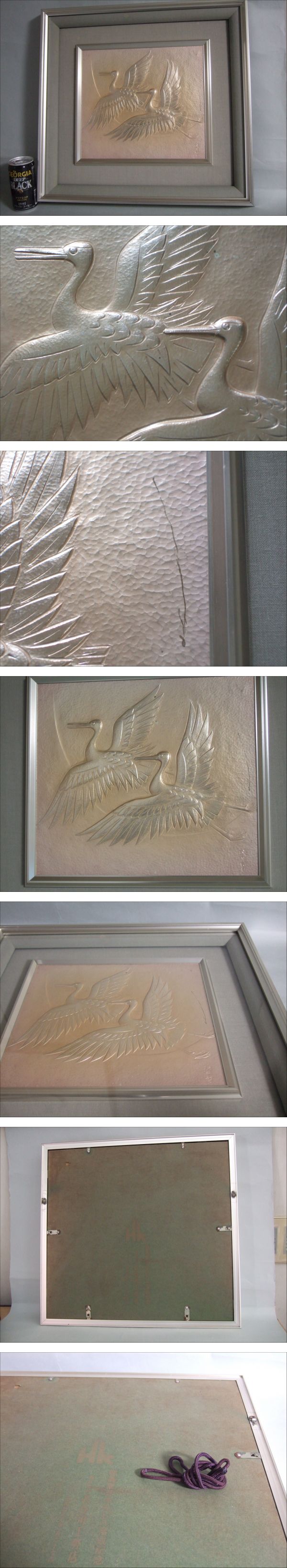 | 商品説明 | 人間国宝 金森映井智(かなもり えいいち)先生の彫金作品。 大きな羽根を広げて飛ぶ二羽の鶴、縁起の良いモチーフです。 同手多数、只この品は初期制作もの。それゆえ画面に幾つかのよごれ、 額は経年感、マットはアセ感あり。鑑賞には特に支障はないかと思います。 画像ご確認のほど。ご納得のうえ御入札願います。 額寸 = 高さ41cm 幅43.5cm 奥行4.5cm。送料 無料にて承ります。 |