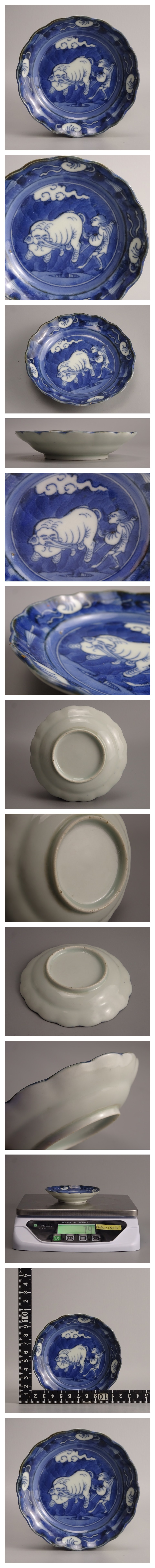 江戸時代 後期 古伊万里 染付 白抜き 象使いの図 輪花形 皿 小皿 希少 珍品 【飾皿 額皿 手塩皿 民藝 コレクター】 r7 1215 10 收藏
