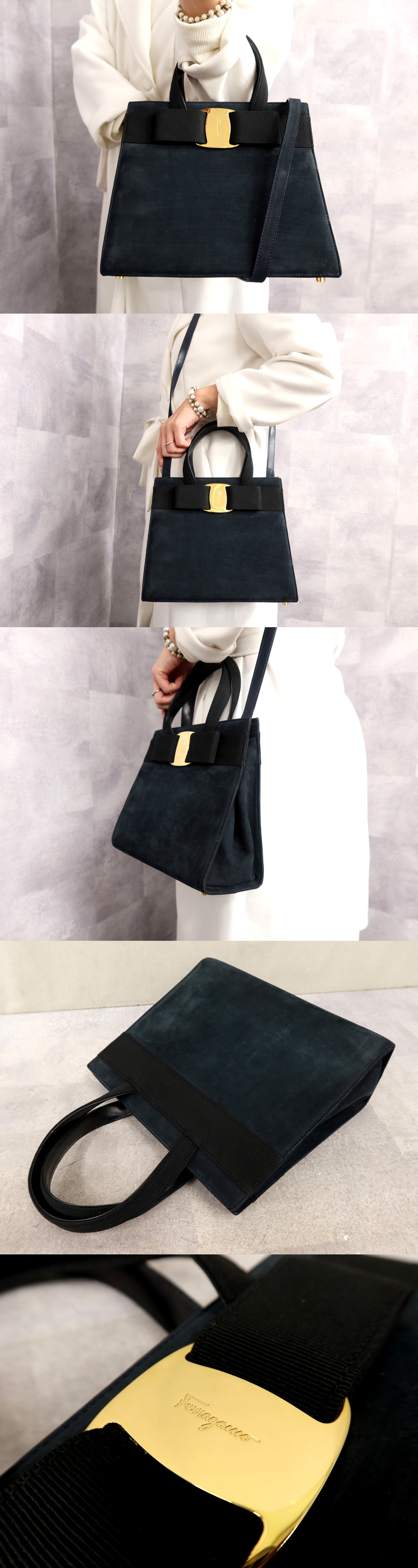 ●超美品●フェラガモ●ヴァラリボン●スエード レザー 本革●2way ハンド バッグ●黒 ダークネイビー●G金具●ヴィンテージ●Js63523 收藏