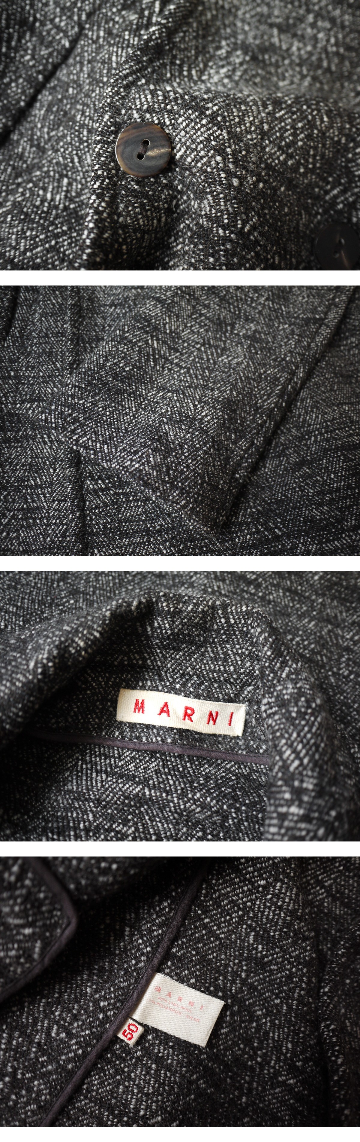 brand MARNI made in Italy material wool 88% nylon 12% color charcoal gray size 50 肩幅47 着丈78 袖丈68 脇下身幅56 (多少の誤差はご了承くださいませ) 状態 使用感のあまり感じられない美品となります。裏地含めダメージは見受けられず末永くご使用頂ける状態です。 |