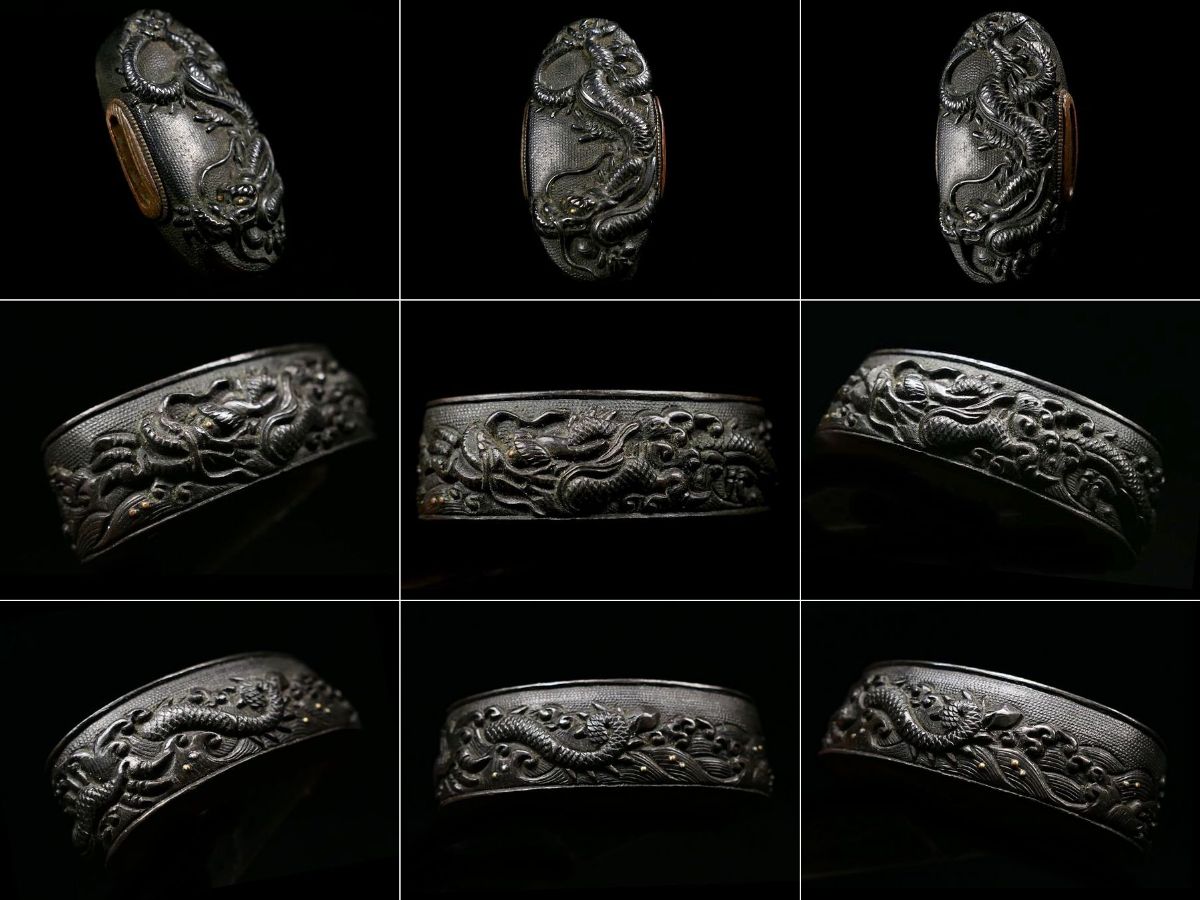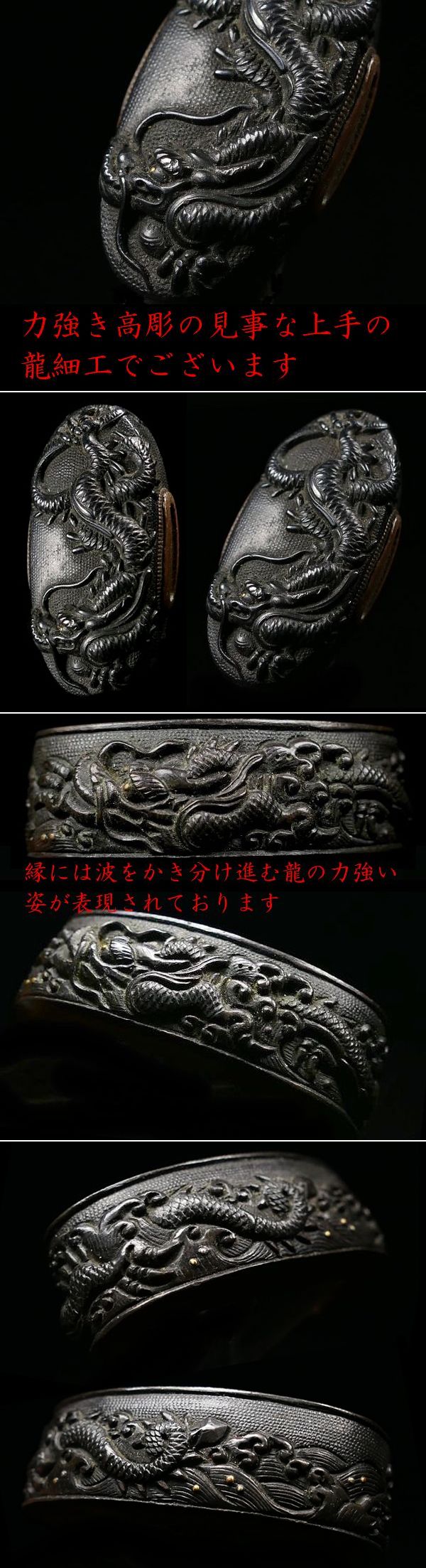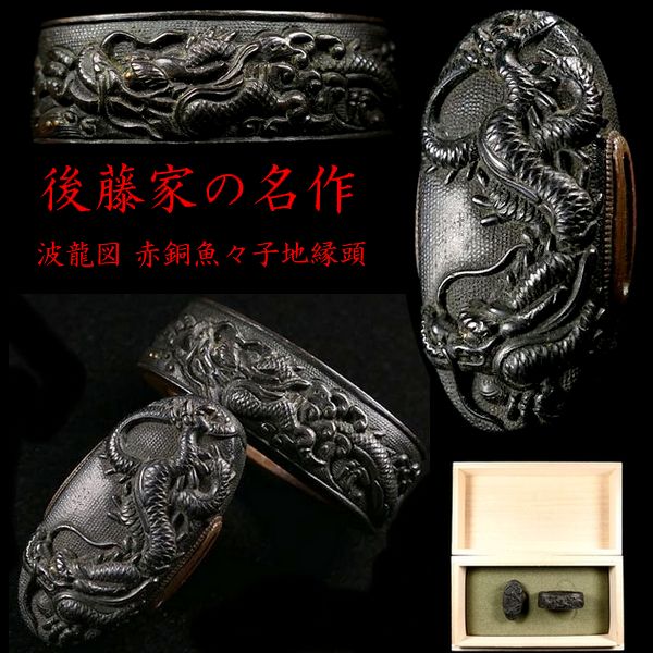 後藤家の名作を彷彿とさせる上級縁頭 極上波龍図 金象嵌 赤銅魚々子地縁頭 上手の高彫細工 桐箱付 検:刀装具 【安値出発】d002 收藏