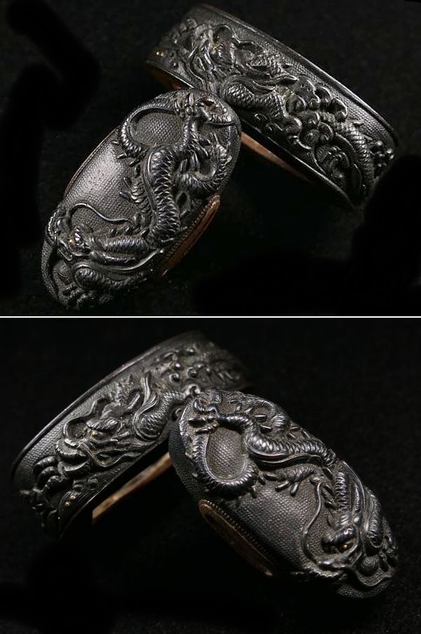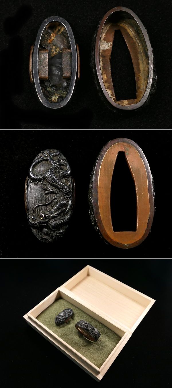 | 商品説明 | 材質:赤銅魚々子地 力強き上手の高彫細工により 繊細で迫力ある極上の「波龍図」が施された 後藤家の名作を彷彿とさせる上級縁頭です。 荒波をものともしない力強い龍の姿が表現された 無銘の名作と言える一品と存じます。 この機会に是非手に入れて下さい。 特に気になる傷みは無く概ね良好です。 古い物ですので多少の時代傷みはご理解下さい。 状態等詳しくは画像にてご判断下さい。 |