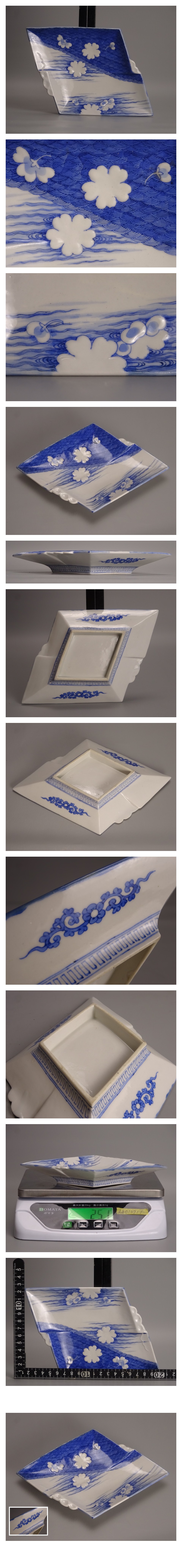 江戸時代 後期 古伊万里 染付 青海波 陽刻 花文 菱形皿 高台皿 変形皿 櫛高台 鍋島・古九谷風の逸品【骨董品 古美術品 盛期鍋島 後期鍋島】 收藏